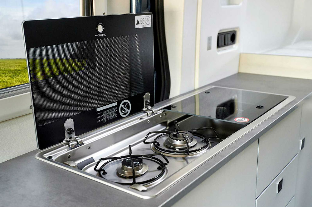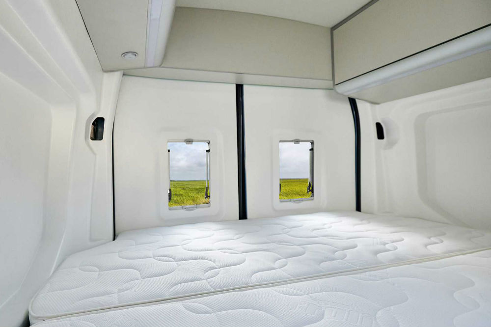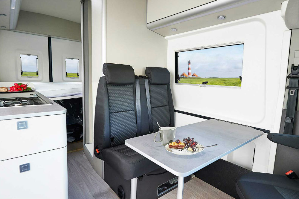 En la parte delantera, los asientos del conductor y del acompañante pueden rotarse por completo, para formar un comedor /sala de estar bastante espacioso. En la zona intermedia se encuentra el baño separado, que está formado por un inodoro, un lavabo y una ducha. Junto a esto se encuentra la completa cocina que cuenta con dos quemadores de gas, una nevera con 70 litros de capacidad y un fregadero. Por último, en la parte trasera, el dormitorio tiene una cama de dos metros de largo y 1,30 de ancho colocada a lo largo del vehículo y en la que pueden dormir dos personas adultas.
