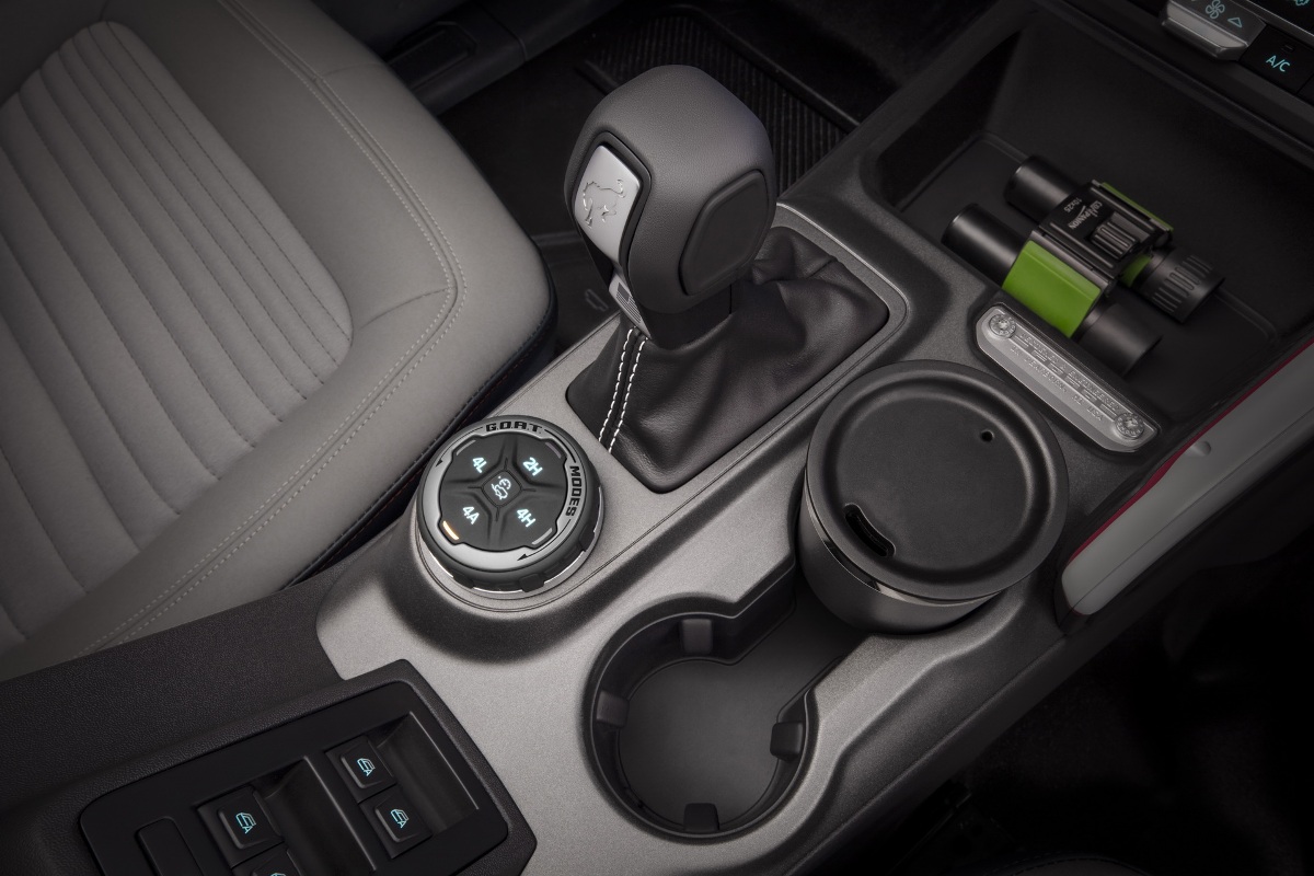 El salpicadero se puede equipar con diferentes soportes para smartphones o cámaras de acción. A nivel tecnológico, el Bronco incluye el sistema de información y entretenimiento SYNC4 de Ford, dotado de una pantalla táctil de 8 pulgadas (opcionalmente puede ser de 12 pulgadas), actualizaciones online y navegación off-road. El sistema también utiliza cámaras de visión 360 grados destinadas a facilitar una visión más clara al conductor cuando se enfrente a obstáculos fuera de la carretera.
