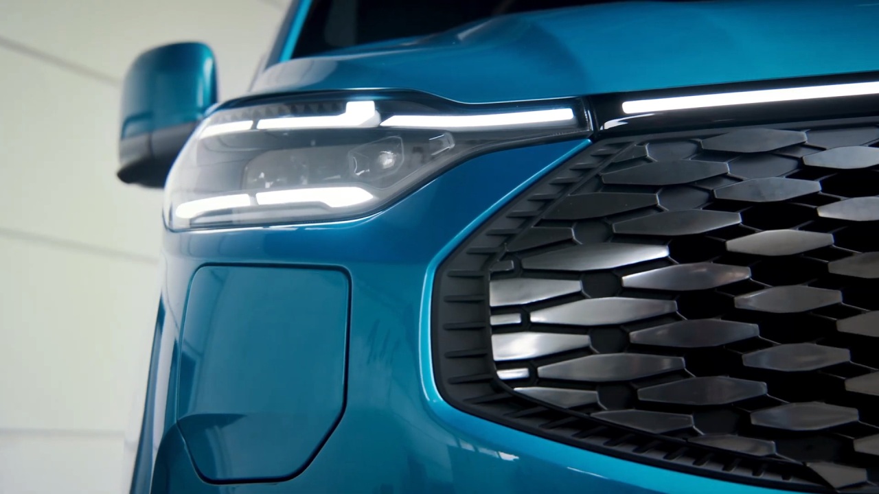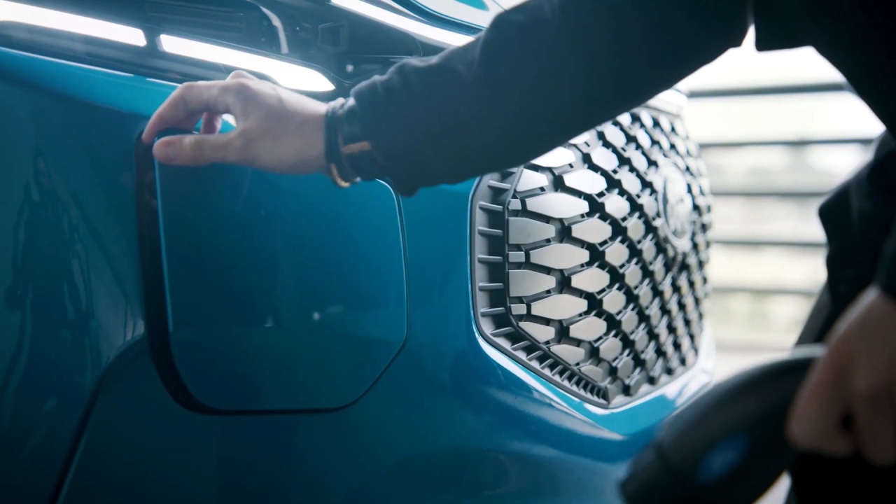 A nivel de diseño podemos ver un frontal con una gran parrilla parcialmente carenada y unos pilotos de LED que se unen en una sola pieza que recorre todo el ancho del vehículo. También tiene un parachoques de aspecto más agresivo con una pequeña entrada de aire central inferior y el punto de carga ubicada en un lateral. El capó inclinado continúa hacia el techo a través de una luneta delantera también inclinada.