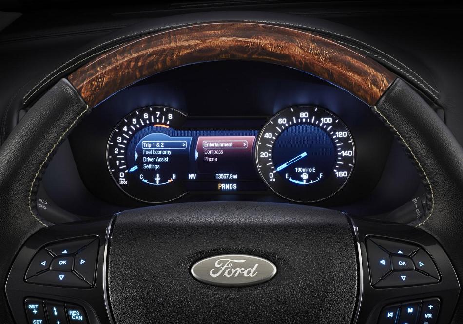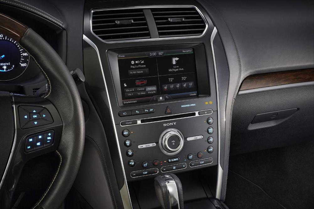 La parte interior del Ford Explorer 2016 incluye inserciones en el salpicadero, un sistema de infoentretenimiento Sony con pantalla integrada en la consola y marcadores digitales. El interior se ve mejorado en el acabado Platinum, donde el Explorer 2016 está disponible con asientos de cuero perforado Nirvana, molduras satinadas de madera de ceniza y aluminio cepillado y el volante de cuero calefactado con inserciones de madera.