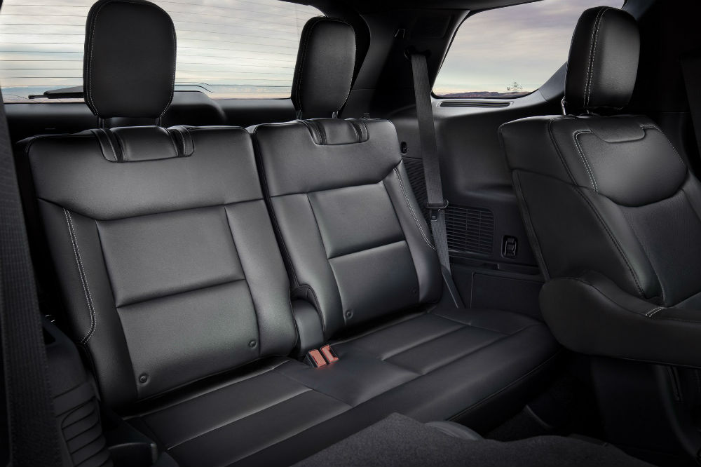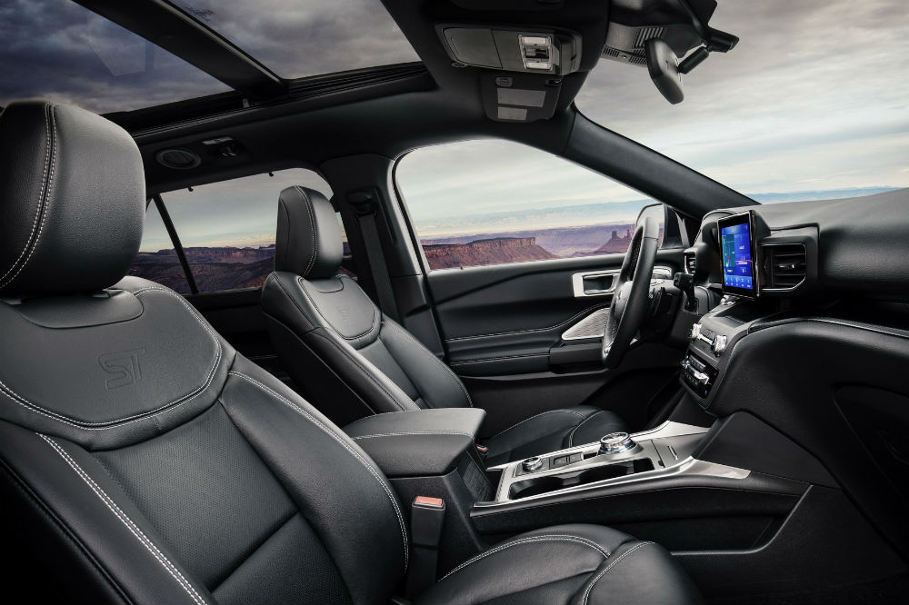 El interior del Ford Explorer ST también recibe su ración de elementos distintivos, como es la tapicería de cuero con los logos bordados y las costuras de contraste blancas, el volante calefactado forrado en piel achatado en su extremo inferior, alfombrillas específicas y pedales de aluminio.