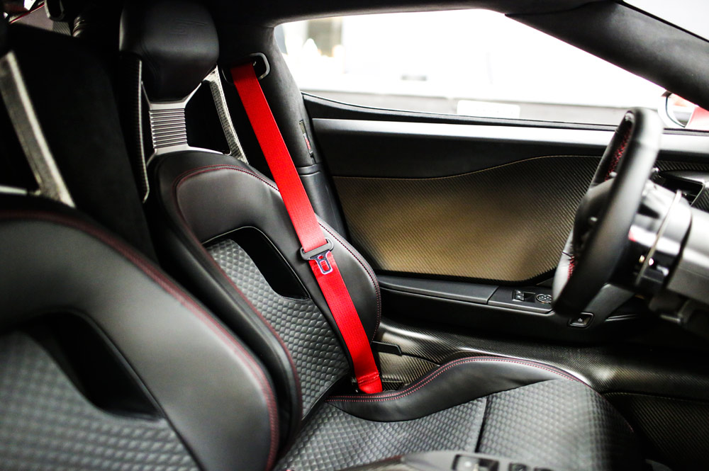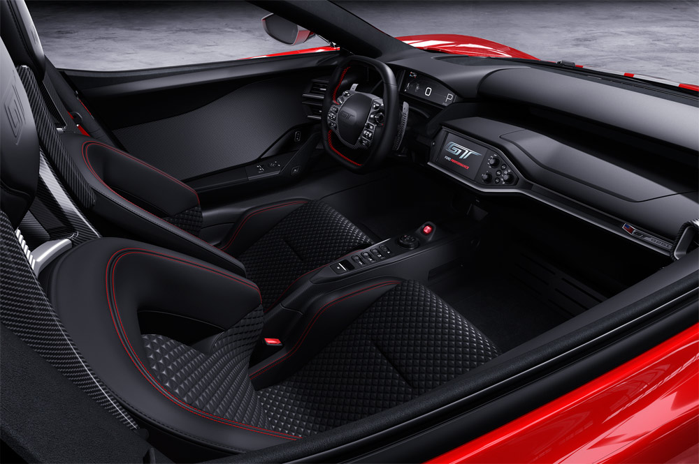 El habitáculo también acoge elementos exclusivos, como los asientos con tratamiento en carbono y costuras en rojo, mismo efecto utilizado en el volante. Esta tonalidad también se ha usado para crear los cinturones de seguridad, mientras que para las levas, se ha optado por el gris anodizado. Las molduras de acero inoxidable satinado se han instalado en los umbrales de las puertas, así como en la consola central. No podía faltar la placa identificativa del Ford GT '67 Heritage Edition ni los apliques en fibra de carbono, mismo elemento utilizado en los panales de las puertas y en el túnel de transmisión.