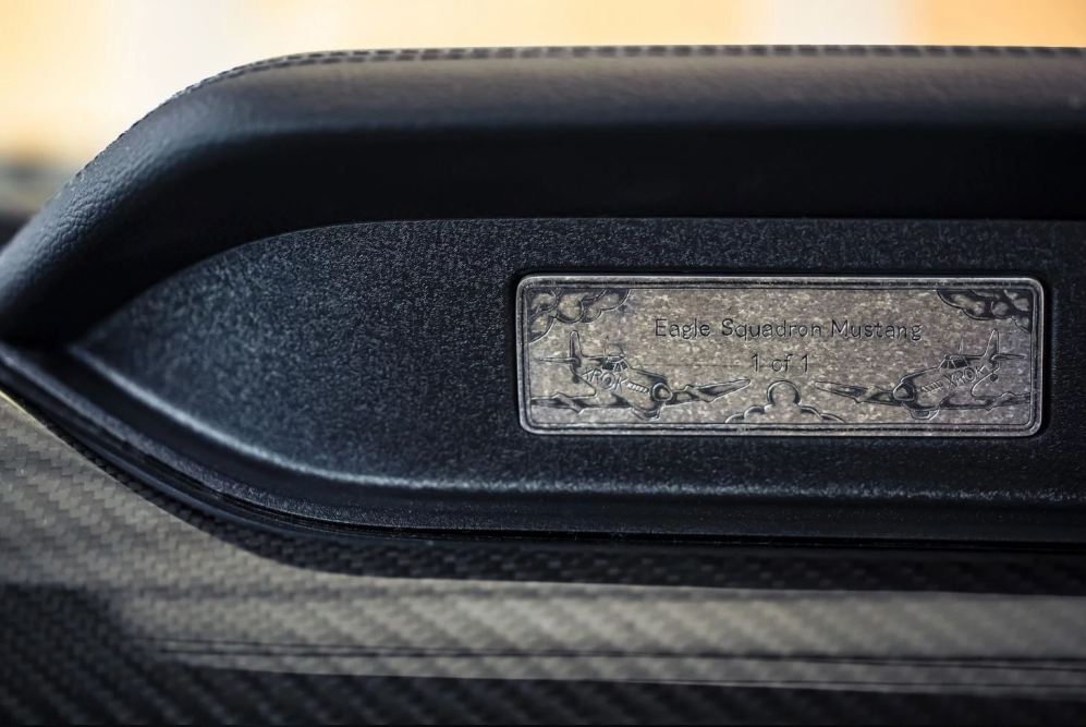 Los conductores encontraran en el interior del Ford Mustang GT Eagle Squadron una cabina personalizada con cuero en los asientos Recaro de carreras con los logotipos del escuadrón de combate bordados. Otros detalles únicos incluyen un pomo para la caja de cambios grabada a mano hecha de piezas de un F-35 Lightning y una placa también grabada a mano con aluminio proveniente de un Spitfire.