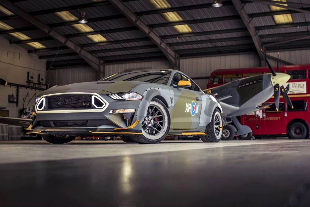 Además de la característica decoración exterior de camuflaje que se inspira en los aviones Spitfire utilizados por el Eagle Squadron durante la Segunda Guerra Mundial, el Ford Mustang (prueba) recibe un completo kit de carrocería de fibra de carbono firmado por RTR, la marca del famoso piloto de Fórmula Drift, Vaughn Gittin Jr. Los diseñadores también instalaron taloneras laterales y un alerón trasero modificado inspirado por los flaps de los aviones de combate.