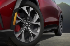 En la vista lateral, destaca su amplia distancia entre ejes y cortos voladizos, su marcada línea de cintura, la ausencia de tiradores convencionales para abrir las puertas, su inclinado parabrisas o el techo, que desciende suavemente hasta llegar a la zaga. Aquí nos encontramos con unos pilotos de diseño de barras verticales, un claro guiño al Mustang original. Estos se sitúan parcialmente sobre el portón que da acceso al maletero trasero.