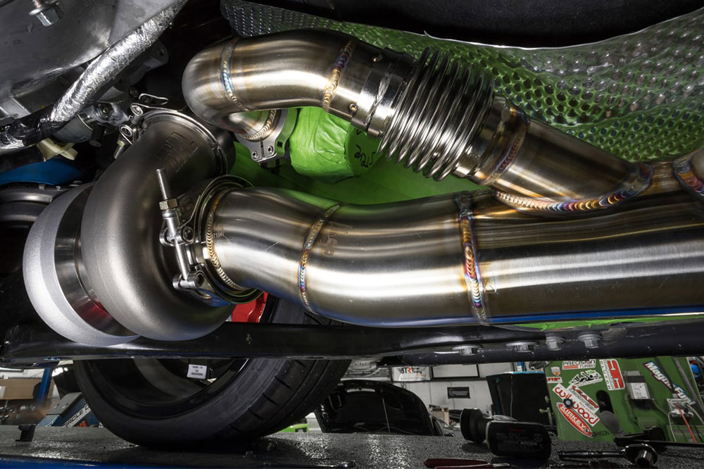 La ubicación de estos turbos en el Ford Mustang Shelby GT350 de Fathouse obedece a una mejor gestión del calor. Además, el hecho de que estén situados ahí también influye en una respuesta más contundente, e igualmente facilita el acceso a la hora de tener que meterles mano. Y no solo eso, sino que Fathouse se ha tomado más molestias. Como la de hacer modificaciones en las válvulas y en los cilindros.