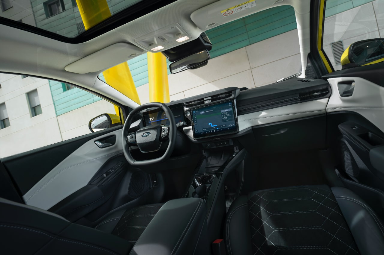 Por dentro, los cambios en este Ford Puma eléctrico son más comedidos: únicamente es nuevo el selector de marchas, que se ha movido a la columna de la dirección para dejar una consola central más despejada