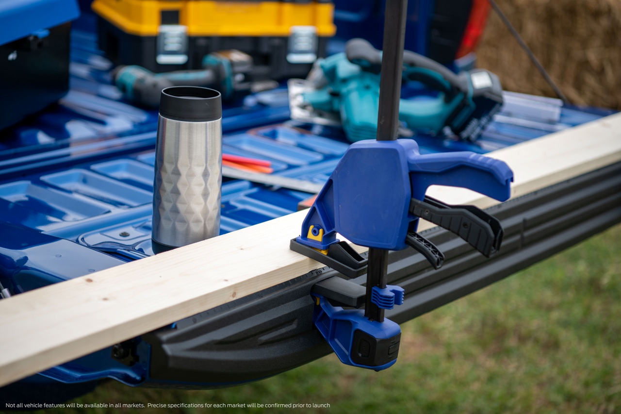 En la zona de la cama de carga se ha instalado un revestimiento de plástico como medida de protección. Hay varios puntos de anclaje y cubiertas para el compartimento, así como un sistema de iluminación específico para esta zona. Además, el portón trasero puede actuar como un banco de trabajo, con regla integrada y huecos para pinzas que permiten medir, agarrar y cortar materiales de construcción. Por último, un sistema de divisores permite alojar objetos de diferentes tamaños.