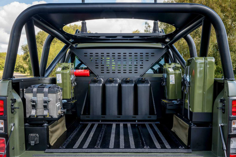 Lo primero en lo que se nota es en el característico color verde mate en el que ha pintado la carrocería, pero las modificaciones son bastante importantes: el techo cuenta con una cama para llevar provisiones adicionales, la caja cuenta con una jaula antivuelco y con un sistema que permite acoplar una ametralladora, tiene armadura, los cristales son a prueba de balas, tiene protección contra impulsos electromagnéticos y es posible instalar sistemas de radio de largo alcance.