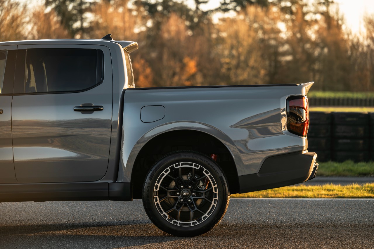 Según Ford, esta combinación de alerones se ha optimizado mediante simulaciones informáticas para mejorar la aerodinámica general. La parte exterior se completa con unas exclusivas llantas de 21 pulgadas (las más grandes ofrecidas en un Ranger) envueltas en unos neumáticos de perfil bajo 275/45 R21.