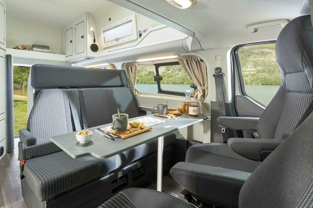 Por lo que respecta al salón, se forma una sala de estar gracias a un sofá con capacidad para tres personas y a los dos asientos delanteros, que pueden girar hasta 180 grados. En el centro se encuentra una mesa plegable.