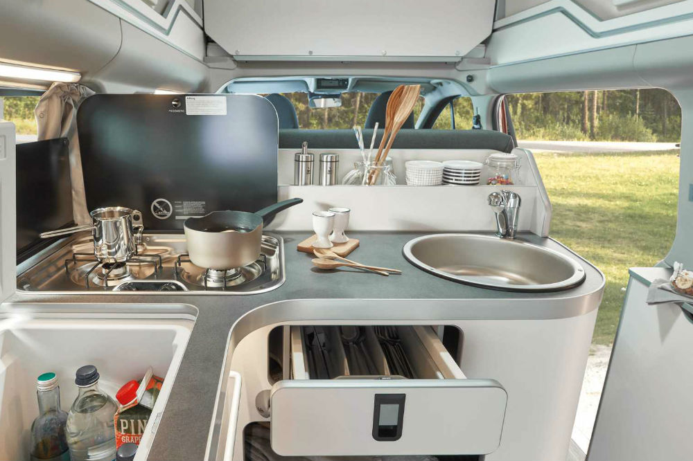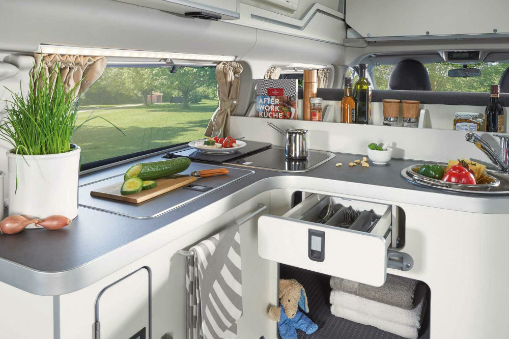 La Ford Transist Custom Nugget dispone de tres ambientes diferenciados: el dormitorio de la parte superior, el salón de estar principal (que se pliega para crear la segunda cama de matrimonio) y la cocina situada en la parte trasera. Ésta cuenta con una dotación muy completa, formada por un fregadero, dos fogones de gas, una nevera con 40 litros de capacidad y dos depósitos de agua de 42 litros cada uno, uno para la limpia y el otro para la usada, sirviendo el primero también para la ducha exterior.