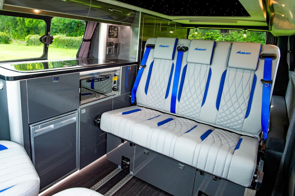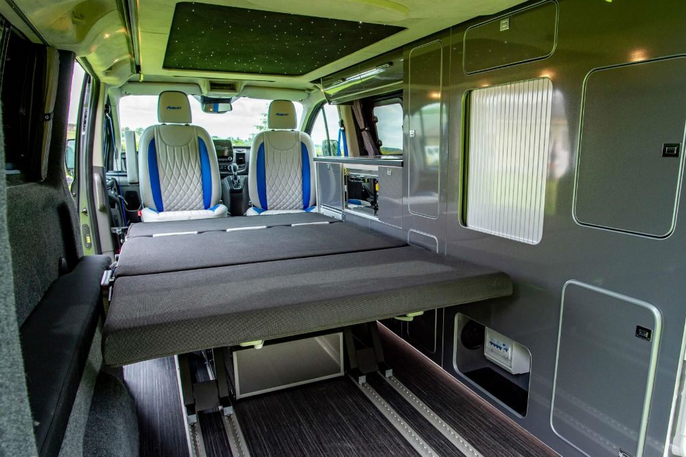 Si por fuera llama la atención, la furgoneta de Ford destaca todavía más en su interior. Los cinco asientos se han tapizado en cuero blanco con detalles en azul, los delanteros se pueden girar para formar un salón y los traseros son regulables en longitud, además de completamente abatibles para formar una cama, el techo se abre para que dos personas más puedan dormir arriba y se ha instalado una completa cocina que cuenta con fregadero, fogones y microondas.