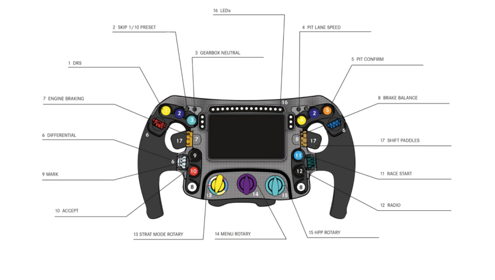 El equipo de Mercedes-AMG Petronas F1 publicó un gráfico el año pasado en el que mostraban para qué servían cada uno de los 17 controles interactivos en el volante y la función que desempeñan. Los coches de Fórmula 1 son máquinas increíblemente complejas, con una gran capacidad para ajustar diferentes apartados del vehículo, como los mapas del motor, la salida del diferencial, el freno motor, el equilibrio de los frenos y la aerodinámica.