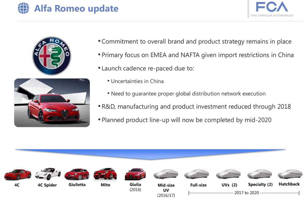 El cambio en los lanzamientos de Alfa Romeo se debe, según indican varios medios, a la incertidumbre del mercado chino y a la necesidad que tiene la marca de garantizar una red de distribución adecuada, por lo que Alfa Romeo reducirá el gasto en investigación, desarrollo y fabricación hasta el 2018. Esto ha provocado una alteración en la fecha prevista originalmente para la introducción de sus nuevos productos.