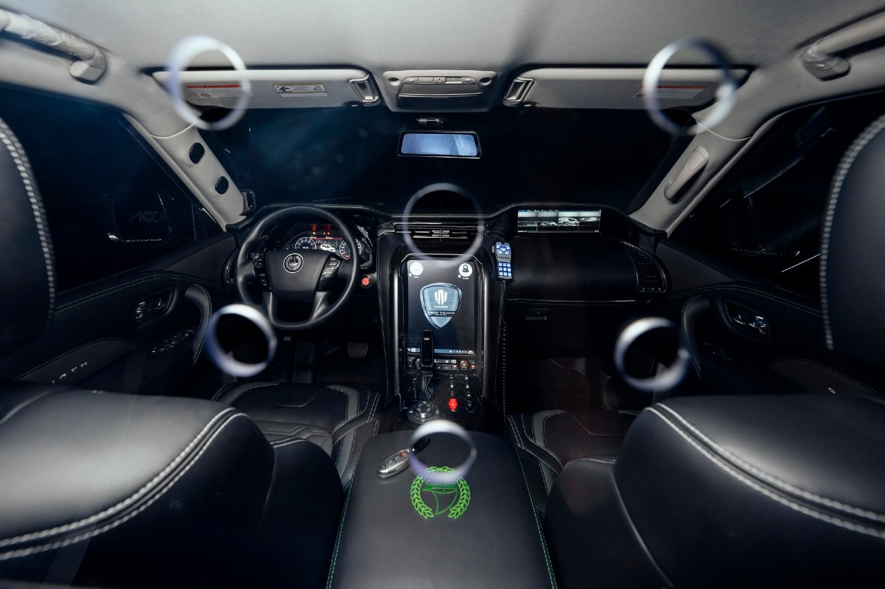 Si llamativo resulta por fuera, por dentro no lo es menos. Está equipado con avanzados sistemas tecnológicos, una pantalla central de 16 pulgadas, un potente ordenador de a bordo, una gran pantalla que separa la cabina de las plazas traseras, una cámara de 360 grados, ocho cámaras de vigilancia exteriores y un sistema de reconocimiento facial y de matrículas.