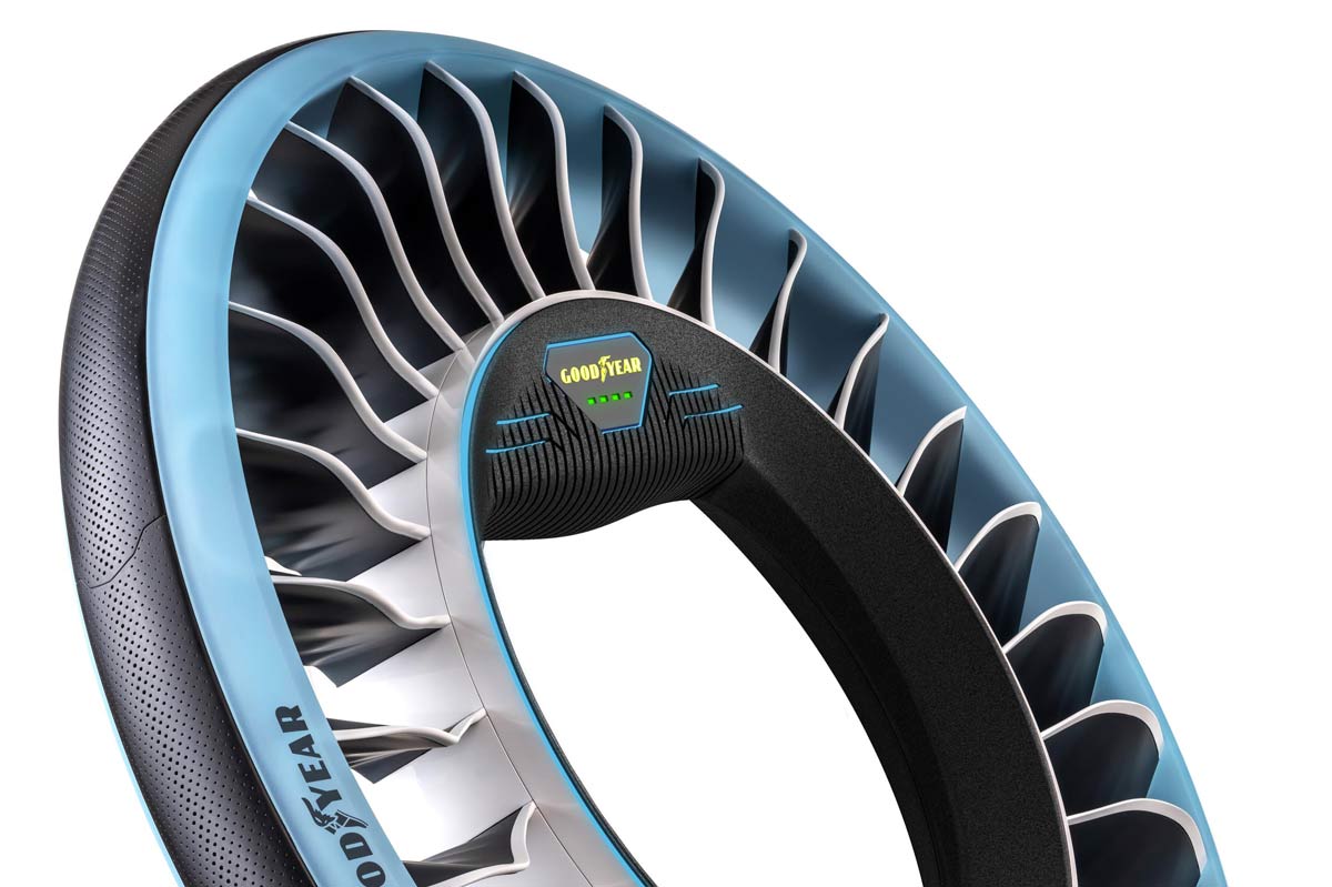 También sensores de fibra óptica para monitorizar las condiciones de la carretera, el estado de las cubiertas y el desgaste de las mismas. No podía faltar, tratándose de un producto del futuro, la Inteligencia Artificial. Mediante un procesador, el Goodyear Aero recomendaría una acción determinada e identificaría y resolvería problemas relacionados con los neumáticos antes de que ocurran.