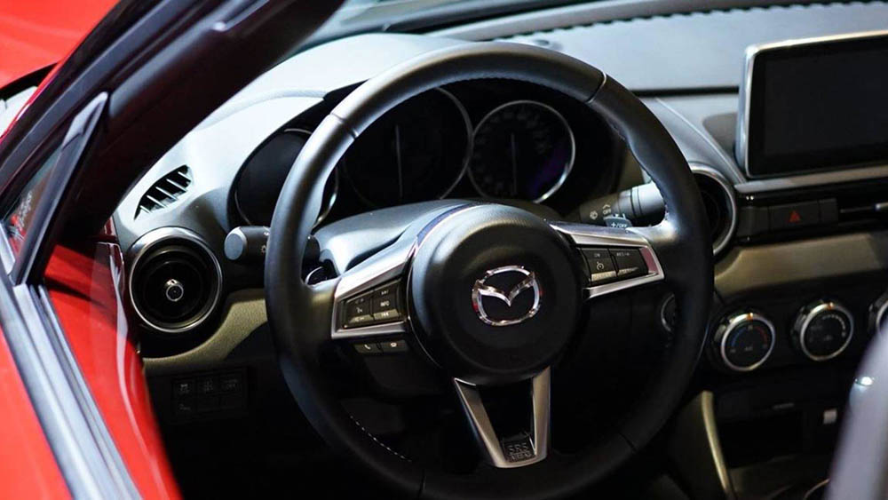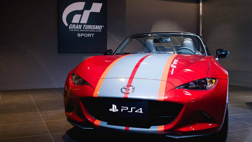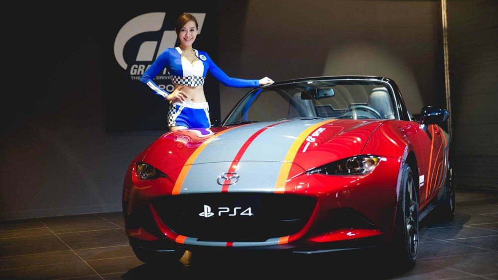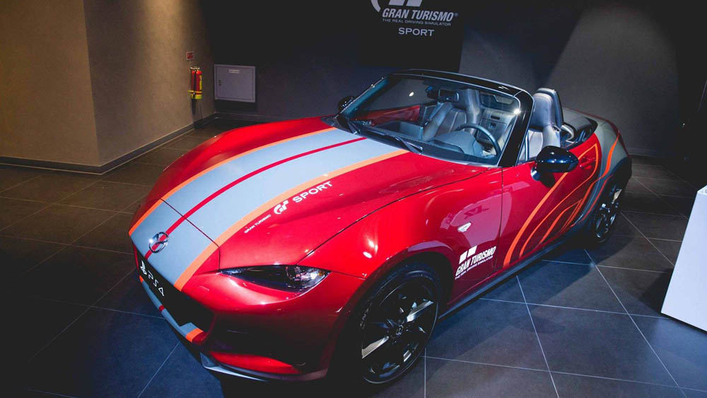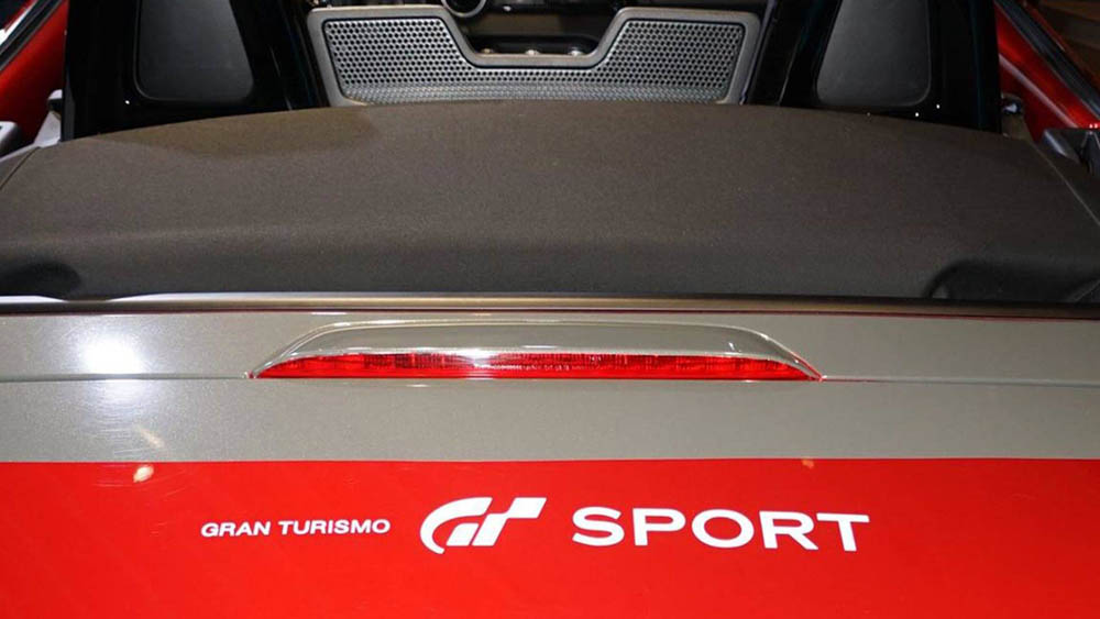 El Gran Turismo Sport Super Bundle, que es así como se denomina el paquete, cuesta 1.398 millones de dólares taiwaneses, unos 41.470 euros. Sí, has leído bien, más de 40.000 euros, pero, obviamente, además de la PS4 Pro y del juego, trae unos cuantos caramelitos más. El más grande es un Mazda MX-5 de última generación que ya hemos probado, un deportivo descapotable que en el mercado español parte de 21.500 euros. Está edición especial tiene como base el color Soul Red, sobre el que se han añadido adhesivos: bandas en color gris y naranja, el nombre del videojuego en el capó y en los costados, así como en los laterales el logotipo de Gran Turismo.