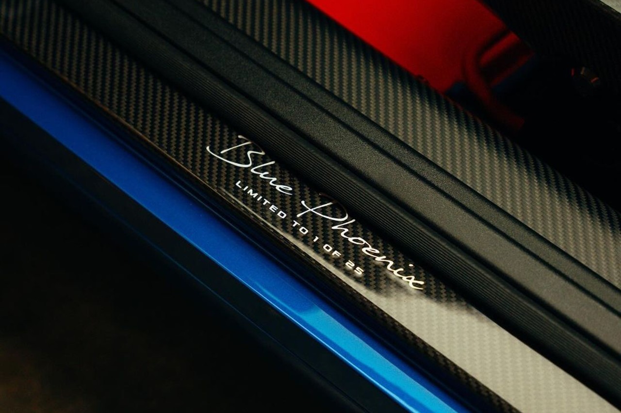 El interior cobra vida con la parte superior del salpicadero de fibra de carbono satinada, inserciones de Alcantara azul Kobalt en el salpicadero, botones de aluminio, contorno del panel de instrumentos de Alcántara azul Kobalt, anillo central del tacómetro de oro rosa satinado, cinturones de seguridad azul Laguna y umbrales de las puertas de fibra de carbono brillante, entre otros elementos.