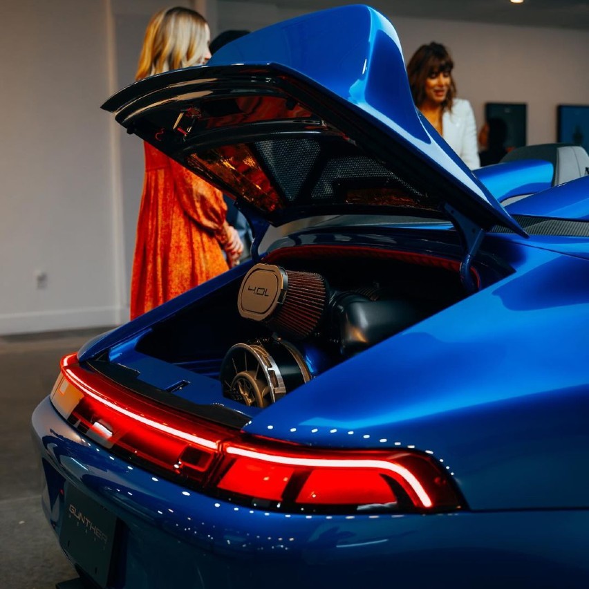 Gunther Werks sólo fabricará 25 unidades, cada una de ellas de forma única, según las especificaciones de su propietario. El que ves aquí corresponde al Blue Phoenix, construido a medida con un acabado Laguna Blue y un interior Prima Nappa Poppy. El acabado exterior incluye un capó totalmente pintado, tiradores de las puertas de aluminio ligero, alerón de cola de pato, luces traseras LED, Splitter delantero brillante, retrovisores Bullet.