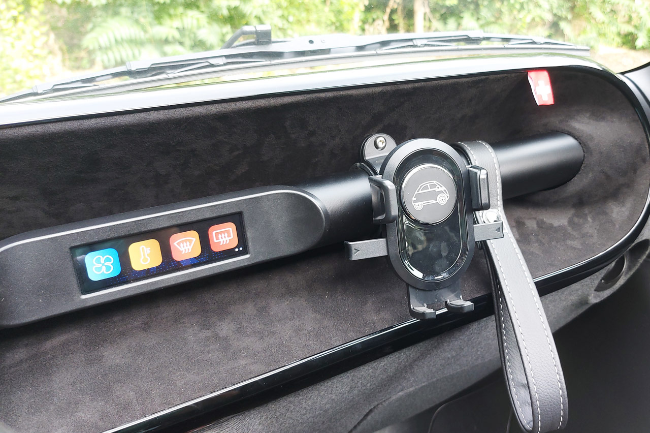 Dentro hay dos pequeñas pantallas, una hace las veces de cuadro de mandos ofreciendo información básica como la velocidad o el estado de la batería (que no la autonomía) y otra, más pequeña y táctil, desde la que se manejan las pocas funciones disponibles. Junto a esta se sitúa un soporte para el teléfono móvil de forma que puedas utilizarlo como sistema multimedia, conectándolo al altavoz inalámbrico que incluye de serie.