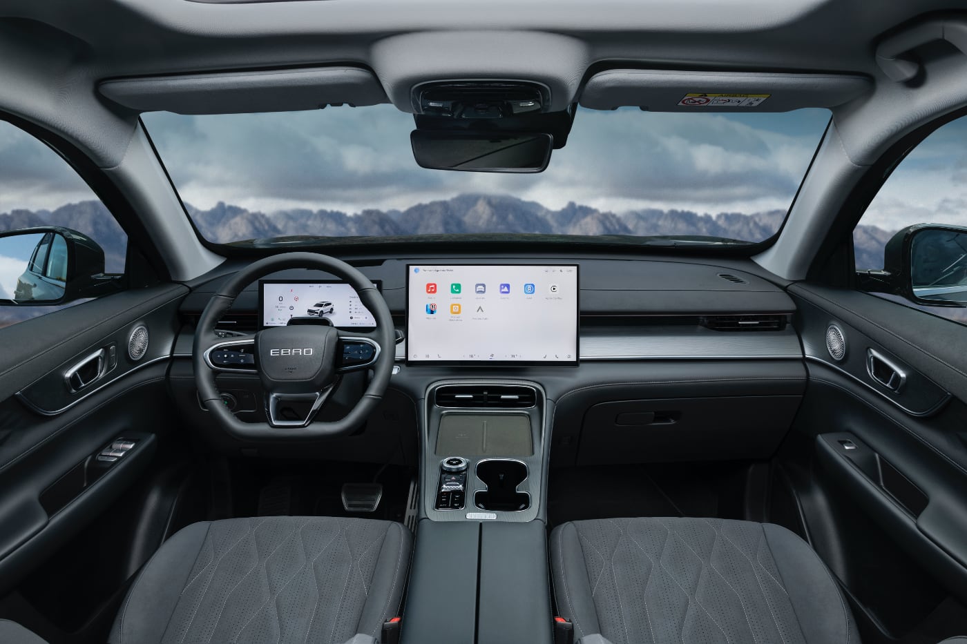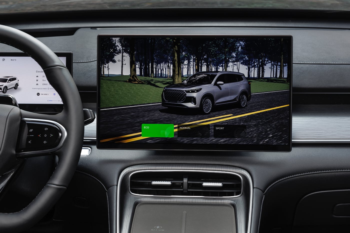 El interior del EBRO S800 está presidido por un cuadro de instrumentos digital de 10,25", pantalla del sistema de infoentretenimiento de 15,6" y un volante tapizado en piel achatado. Este tapa parte de la zona inferior izquierda de la pantalla, donde se hallan algunos 'botones', como el de volver al menú principal. Por cierto, trae botones hápticos, que son los mismos que los del Jaecoo 7, otra marca del Grupo Chery.
