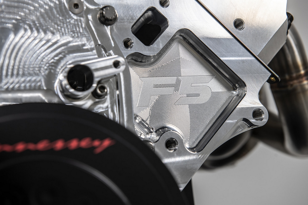 Ubicado en posición central trasera, el Hennessey Venom F5 equipa un motor V8 biturbo de 7.6 litros que está ligado a una caja de cambios secuencial de siete velocidades y que envía la potencia exclusivamente a las ruedas traseras. Por primera vez en su historia, Hennessey Performance ha creado un motor partiendo de cero, con un bloque que es mecanizado a partir de un gran pedazo de aluminio forjado.