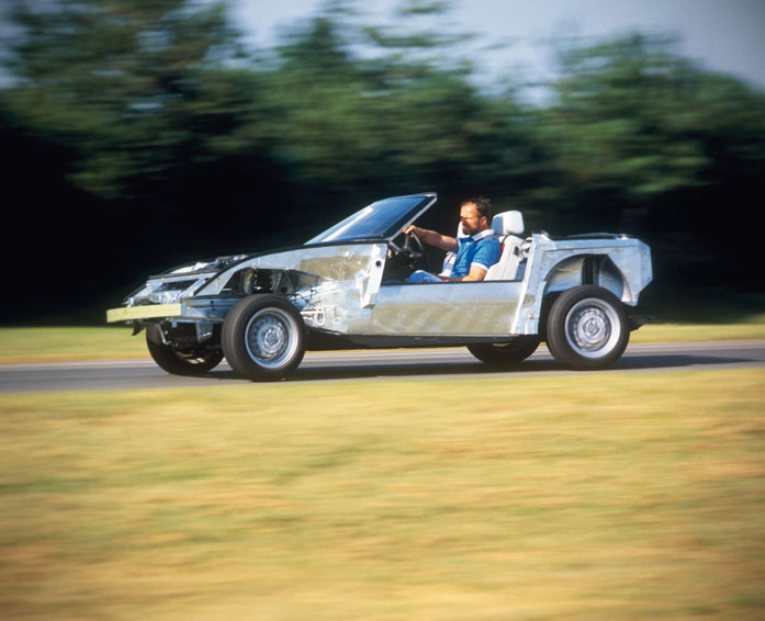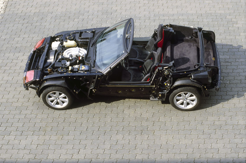 Pero, además de su atractiva imagen, ¿con qué bazas contaba este ‘juguete’? El BMW Z1 sirvió como banco de pruebas de nuevos trenes y materiales de última generación; para muestra, un botón. Su chasis monocasco de chapa de acero galvanizado rodeaba el piso del automóvil, fabricado en resina epoxy y PVC, y reforzado con fibra de vidrio. Gracias a su consistencia, esta estructura podía soportar la carrocería, fabricada en varios compuestos termoplásticos, y el motor del BMW 325i. Hablando del propulsor, este era un 6 cilindros en línea inclinado 20º, tenía una cilindrada de 2.494 cc y rendía una potencia de 170 CV a 5.200 rpm. Todo ello iba a parar a las ruedas traseras a través de un cambio manual de cinco velocidades –en un principio se pensó en la tracción a las cuatro ruedas-. Gracias a su buen rendimiento, el Z1 podía acelerar de 0 a 100 km/h en menos de nueve segundos y alcanzar la velocidad de 225 km/h -unas buenas cifras si tenemos en cuenta sus años de producción: 1988-1991-.