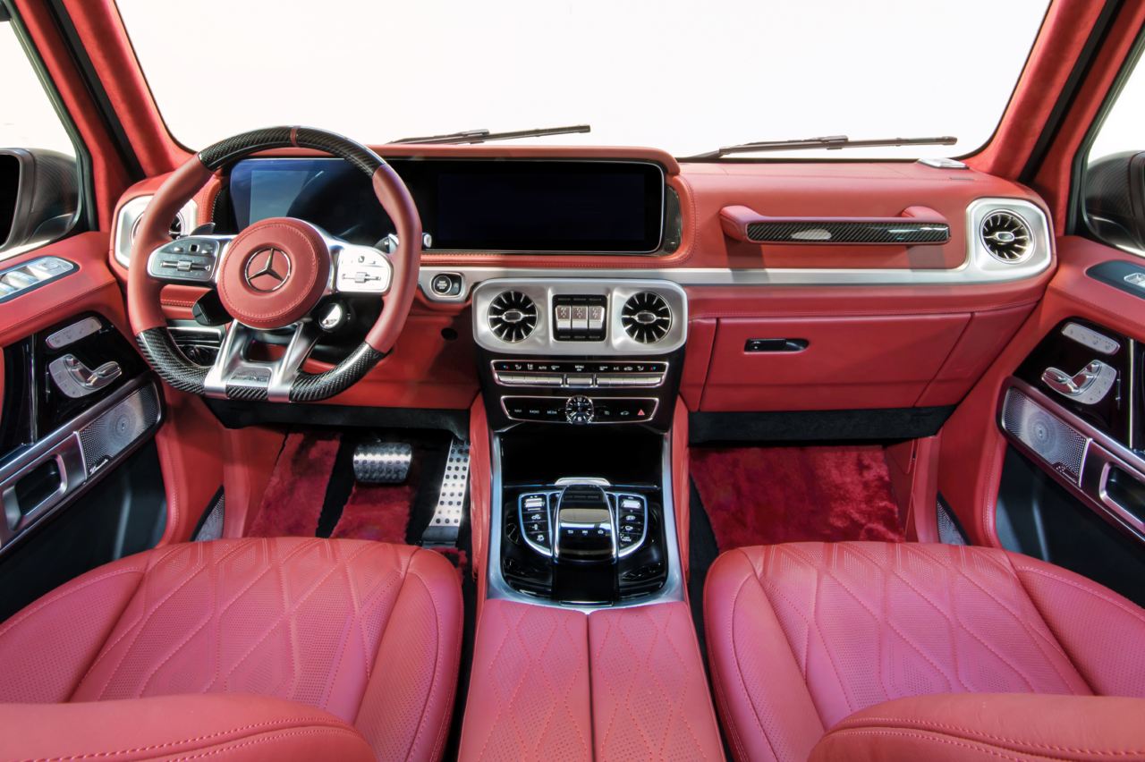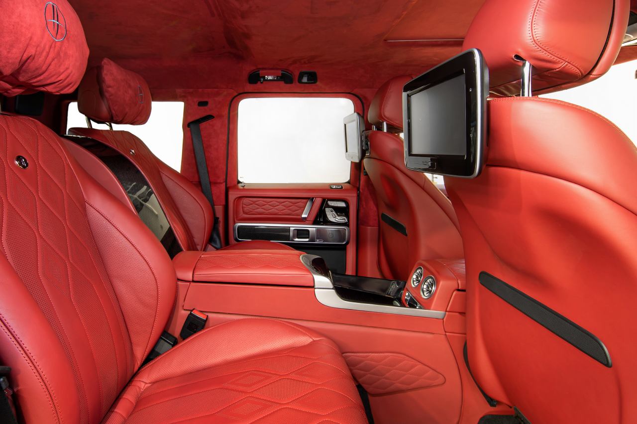 El interior es de todo menos discreto gracias a la tapicería de cuero Nappa y Alcantara de color ‘Rojo Bengala’ que cubre absolutamente todo el habitáculo a excepción de las numerosas molduras de carbono. Lo más destacado es que en la segunda fila se han instalado los asientos individuales ‘Style Two’, que están posicionados 10 centímetros más atrás para aumentar el espacio disponible para las piernas y cuentan con una consola central, ventilación, calefacción masaje, sistema de carga inalámbrica para dispositivos móviles, etc.