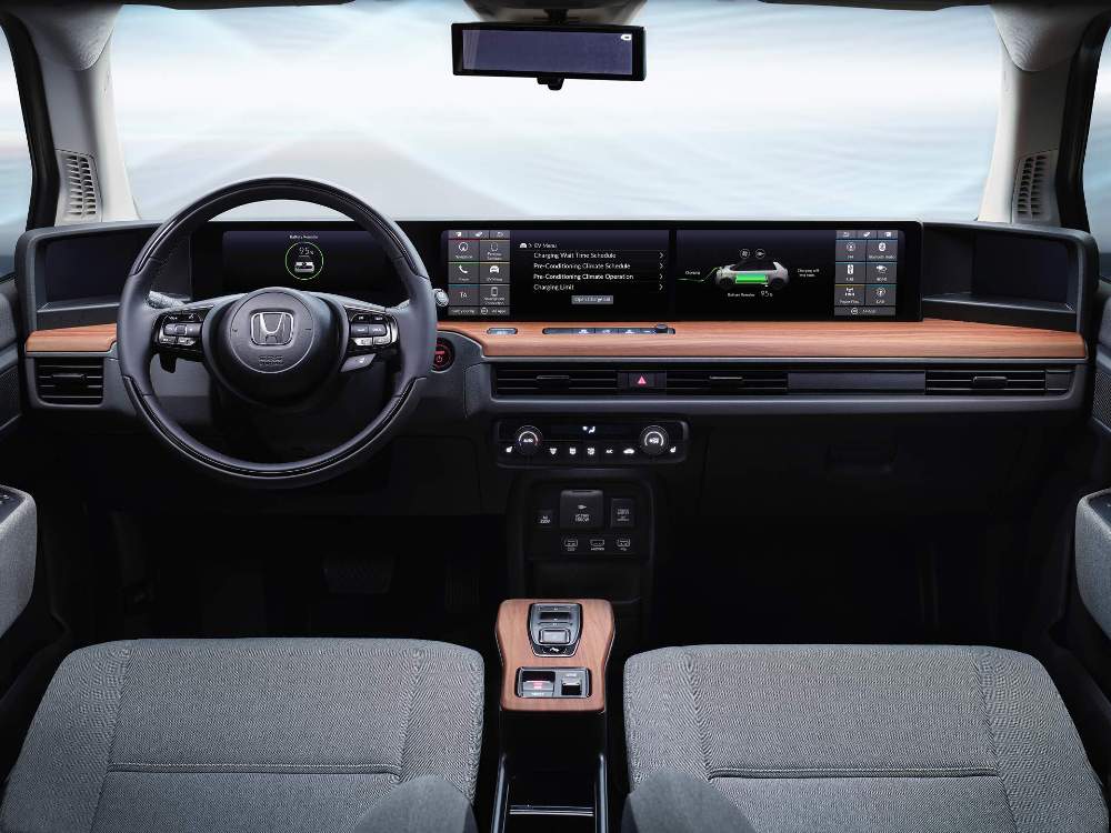 El interior del Honda e Prototype presenta un diseño ‘retrofuturista’ al combinar elementos clásicos como los asientos de tela con una gran pantalla horizontal personalizable que integra la mayoría de las funciones del vehículo. Las dos pantallas del sistema Camera Mirror están integradas en ambos extremos del tablero de instrumentos e incluso el espejo retrovisor central ha sido reemplazado por una cámara.
