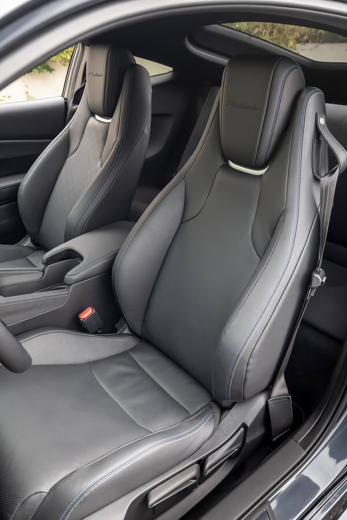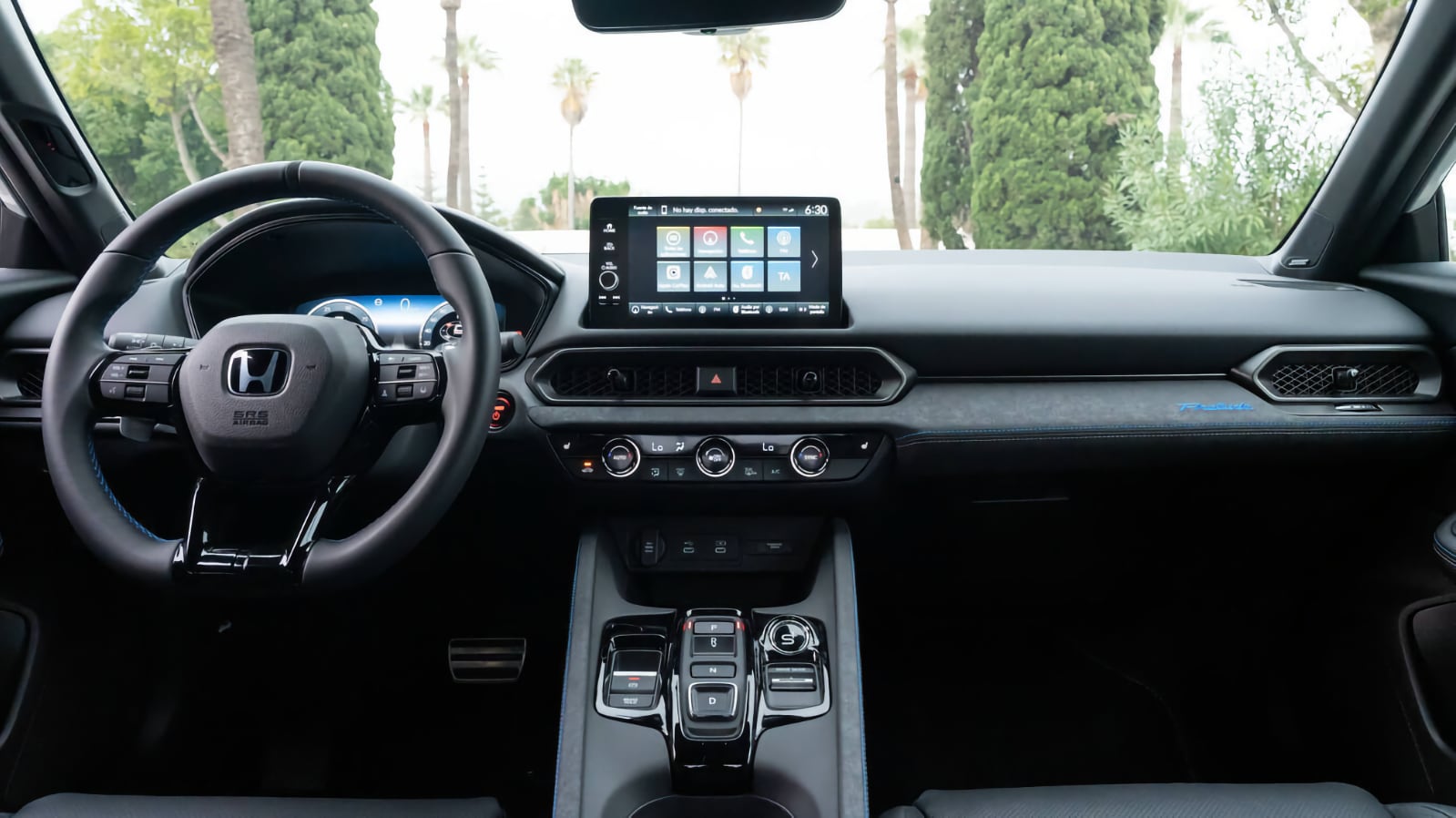 Otra cosa que nos gusta del Honda Prelude 2026 es su puesto de conducción, por su diseño, pero sobre todo, por calidad: materiales gomosos, piel vuelta, pespuntes grises y azules, la inscripción ‘Prelude’ bordada, también en las alfombrillas, volante grueso con pespuntes azules… Tanto la calidad percibida como la visual y al tacto es muy buena.