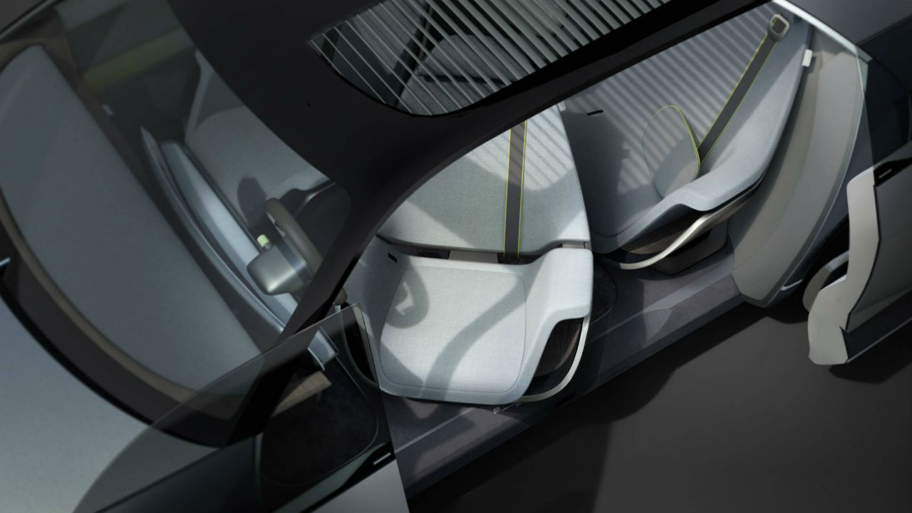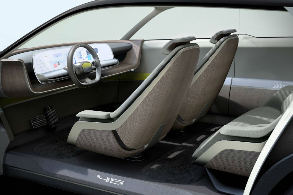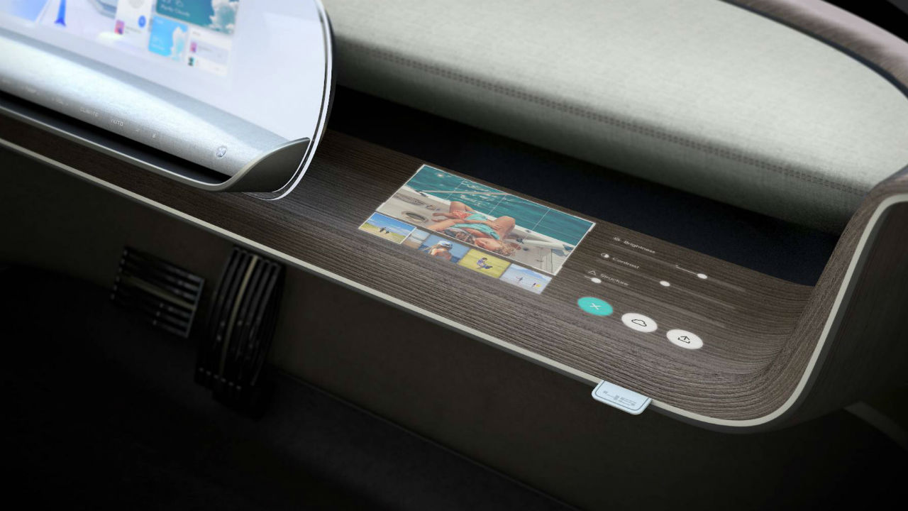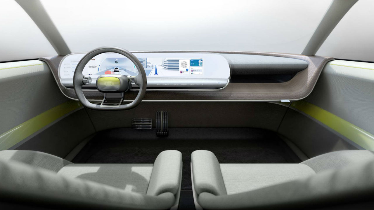 El habitáculo sí que deja clara la naturaleza conceptual del modelo, con un aire muy minimalista en el que las amplias superficies acristaladas permiten que entre la luz natural y donde los materiales más presentes son la madera y la tela. Una enorme pantalla agrupa las funciones del cuadro de instrumentos y la consola central, eliminando los botones y hasta las funciones táctiles, puesto que se encarga de proyectar unos hologramas con los que interactúa el conductor.