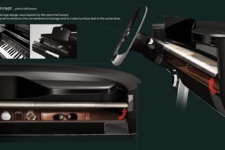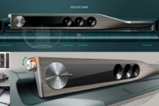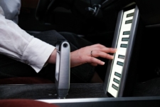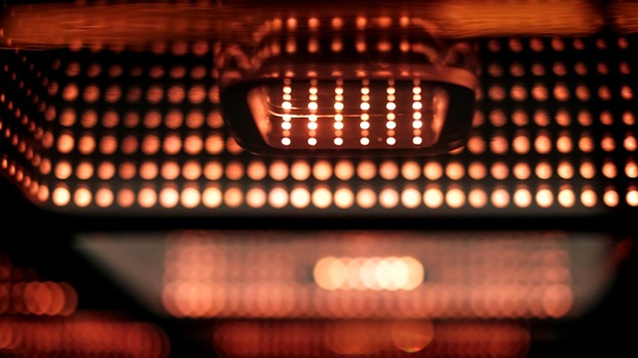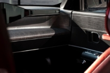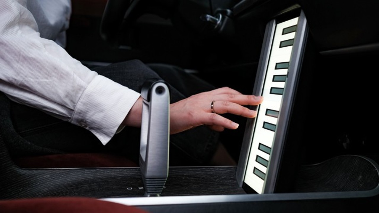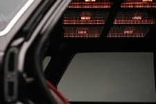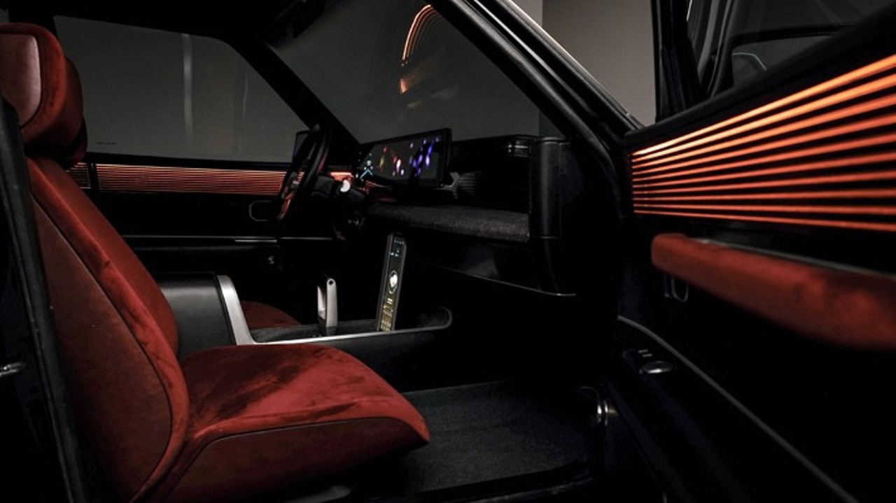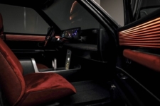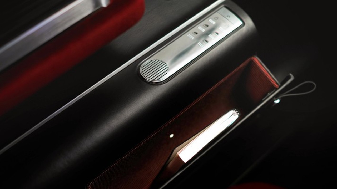 Una tercera pantalla en disposición vertical está situada en la parte inferior de la consola central, delante de la palanca de cambios clásica. Acabados metálicos, superficies planas y rectangulares, combinan con algunos controles táctiles y un sistema de iluminación ambiental de color bronce inspirado en los equipos de sonido antiguos.