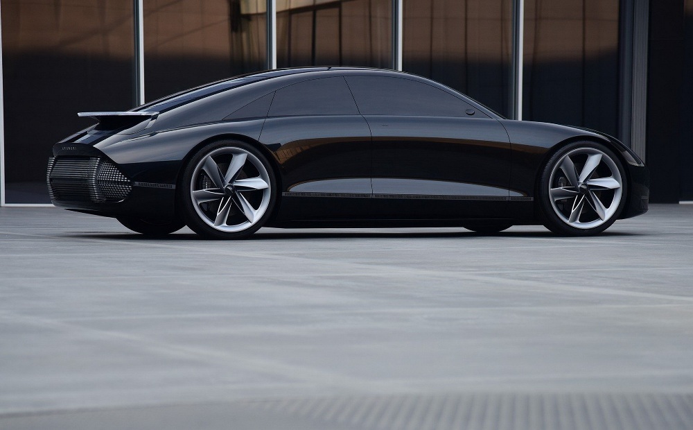 Los faros de píxeles, que debutaron por primera vez en el Hyundai 45 EV Concept a finales del año pasado, también están presentes en el frontal, la zaga y el alerón trasero, y Hyundai asegura que este elemento se convertirá en parte del lenguaje de diseño de sus futuros modelos. La cabina, por otro lado, hace uso de la gran distancia entre ejes y la tecnología de conducción autónoma sin volante ni pedales. En su lugar, encontramos un par de palancas de mando futuristas, una montada en la puerta y la otra en la consola central que atraviesa el interior, otorgando así una configuración de cuatro asientos.