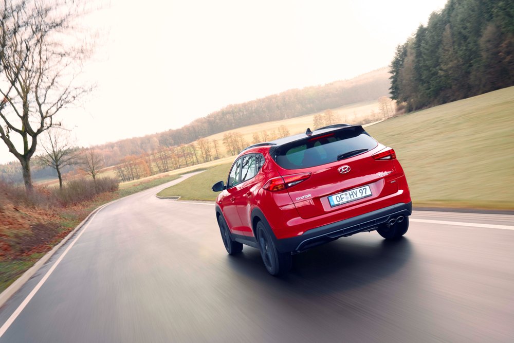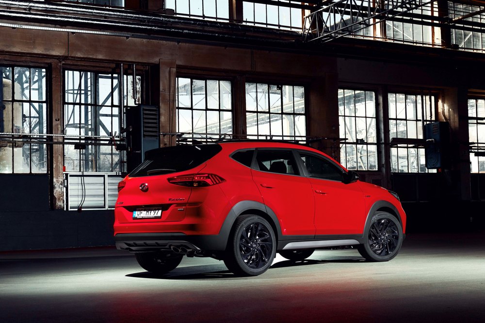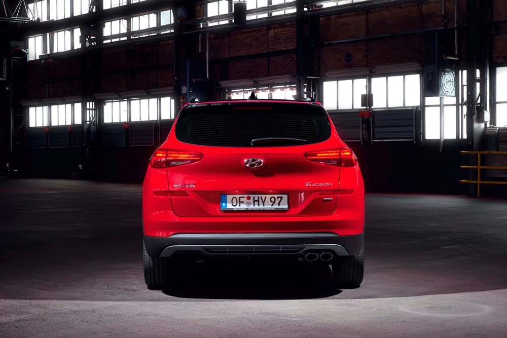 La zaga del Tucson N Line se mantiene algo más conservadora, pero integra un alerón sobre el techo de color negro, a juego con los espejos retrovisores; un parachoques rediseñado y un difusor en negro con una doble salida de escape. Las taloneras nuevas también forman parte del diseño, al igual que los emblemas N Line y el nuevo juego de llantas de aleación de 19 pulgadas pintadas en color negro.