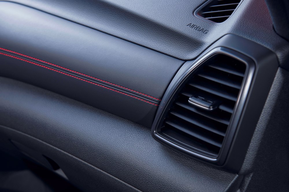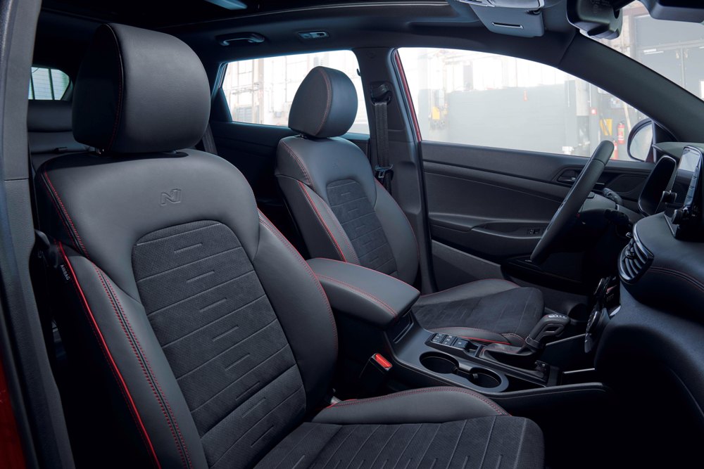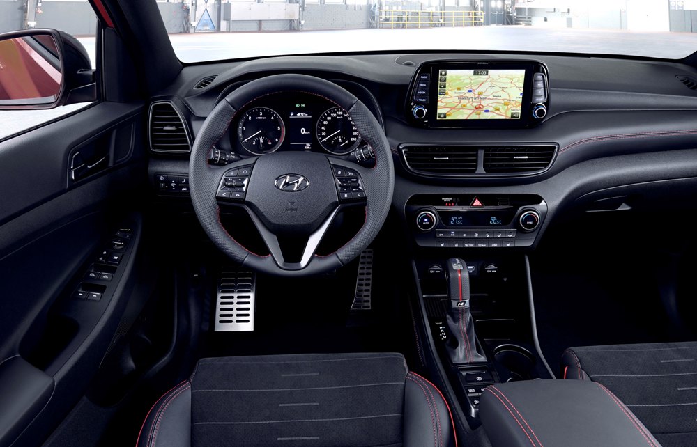 El interior del Hyundai Tucson N Line también recibe una serie de ajustes de carácter propio, como los elementos forrados en cuero negro con costuras en rojo presentes en salpicadero, volante y asientos, la palanca de cambios con detalles en rojo, los pedales de aluminio, un sistema de sonido Krell de nueve altavoces de serie y un techo panorámico de cristal opcional.