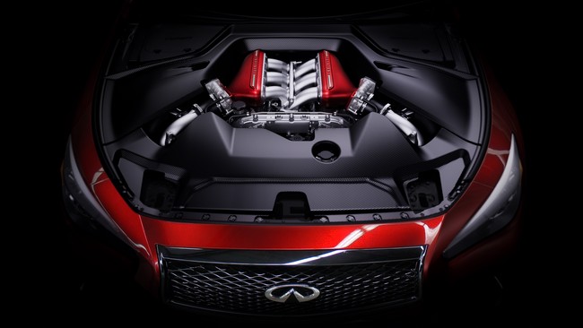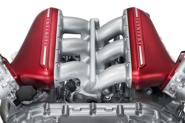El Infiniti Q50 Eau Rouge de calle estará animado por un potente bloque V6 de 3,8 litros de cilindrada, sobrealimentado mediante dos turbocompresores. Aunque Infiniti no se ha pronunciado al respecto, no hay que ser un ‘lince’ para darse cuenta de que podría tratarse del mismo motor que utiliza el Nissan GT-R, pues ambos tienen una cilindrada de 3.799 centímetros cúbicos, seis cilindros en ‘uve’, doble turbo y 24 válvulas.