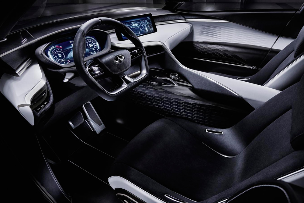 En el interior, lo que esperábamos tratándose de un concept: materiales de primera y formas muy modernas. Cabe destacar la incorporación de un cuadro de instrumentos digital, algo a la orden del día en los fabricantes premium, y de una pantalla única para el sistema de infoentretenimiento en lugar de la doble, como la que equipa el Q50 (prueba Infiniti Q50 2.2d GT Sport automático).