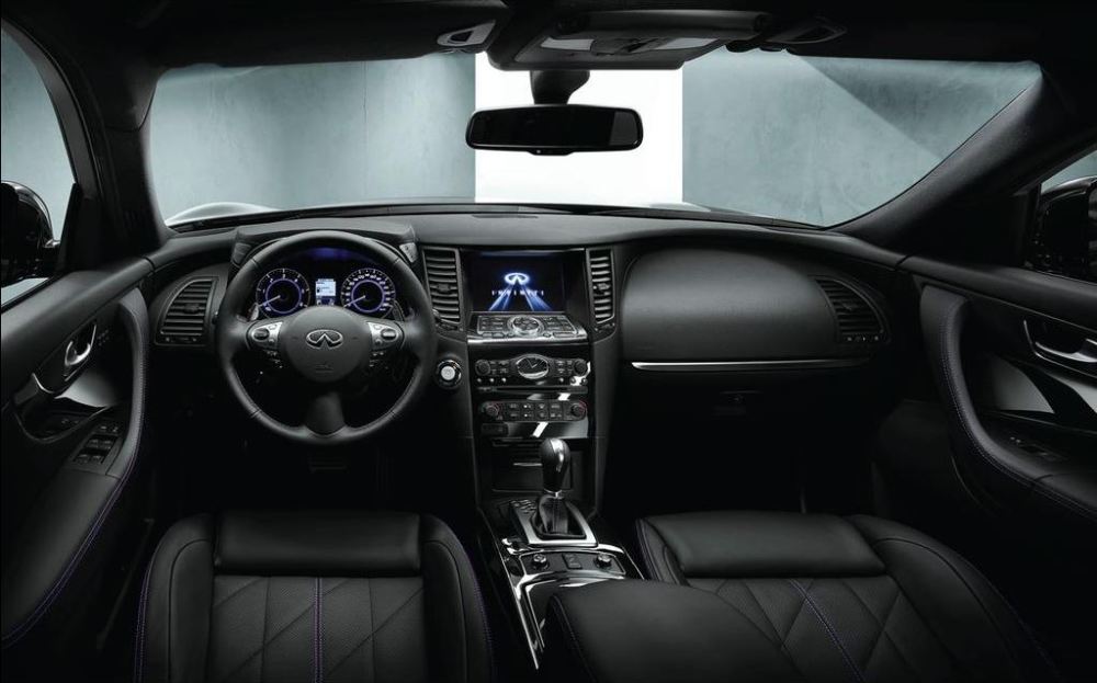 El interior del Infiniti QX70 S-Design sigue la filosofía de diseño del exterior. Mantiene los tonos oscuros como base de la edición especial. La consola en negro lacado otorga el aspecto lujoso al interior, mientras que las costuras en color púrpura, presentes en los asientos, el volante, los reposabrazos y los paneles de las puertas, el contraste deportivo que también tiene en el exterior gracias a las llantas. El nivel de equipamiento del QX70 S-Design es el mismo que el más alto de la gama S-Premium.