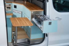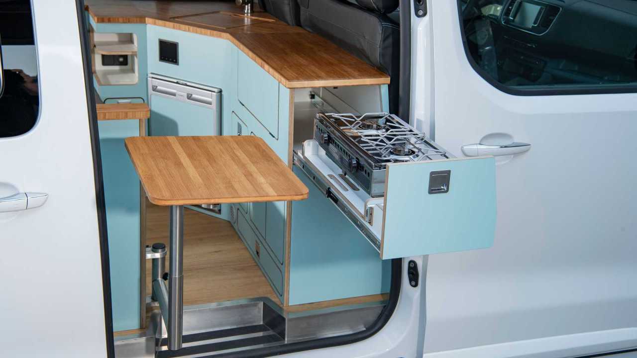 La cabina, por otro lado, presenta un cajón extraíble oculto tras la puerta corredera que permite albergar los dos fogones de gas. También hay una mesa deslizante que sirve como área de preparación de alimentos. En lo que respecta a la zona de descanso, hay una sección extensible para instalar entre los asientos que permite crear una generosa cama para dos ocupantes. Esta unidad no cuenta con techo elevable, pero podría instalarse fácilmente ya que hay otros modelos camperizados basados en el Opel Zafira con este complemento.