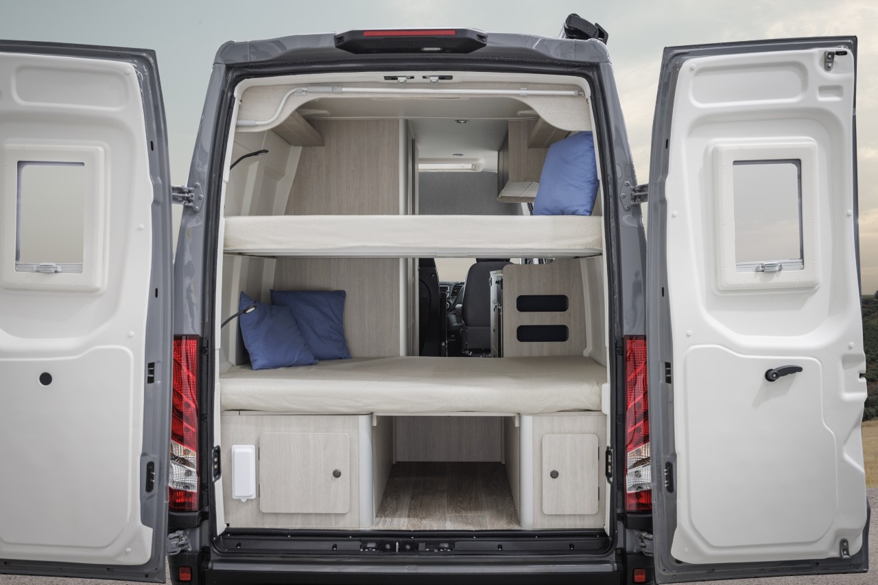 En la parte trasera de la Iveco Daily Camper se sitúa el dormitorio, que permite dormir a cuatro personas gracias a la cama de matrimonio con colchón de tres piezas y a la plegable con colchón de dos. Además, en esta zona hay estanterías y baúles, en uno de los cuáles se integra el depósito de aguas de 84 litros.