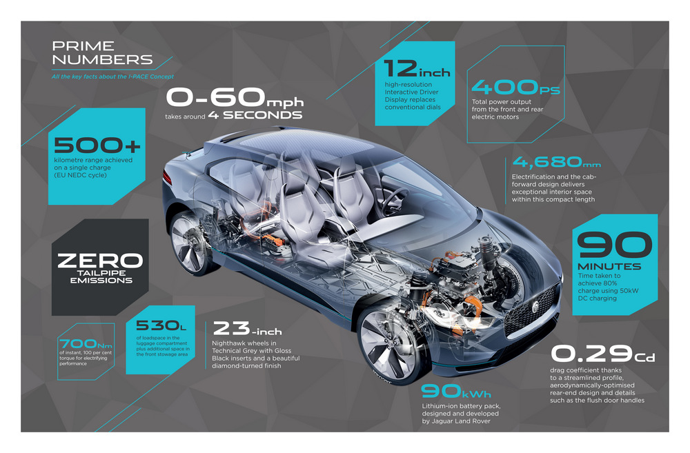 Para moverse, el nuevo I-Pace Concept emplea una batería de 90 kWh, elemento que puede recargarse en poco más de dos horas y que le permite recorrer una distancia de más de 500 km con una única carga, y dos motores eléctricos que, en conjunto, proporcionan 400 CV de potencia y 700 Nm de par. Dado que cada uno de los dos propulsores eléctricos se encarga de mover un eje (tiene un motor situado en cada tren), cuenta con tracción a las cuatro ruedas, lo que le permite pasar de 0 a 100 km/h en unos 4 segundos.