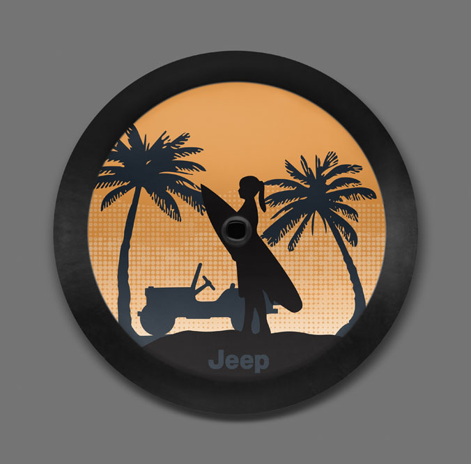 parachoques todoterreno para el Wrangler Rubicon, adhesivos Mopar, cubiertas de neumático de repuesto que incluyen el diseño de la bandera americana, camuflaje y el logo Jeep, asideros, tapas de depósito de combustible y nuevo cableado de remolque, entre otros muchos elementos.