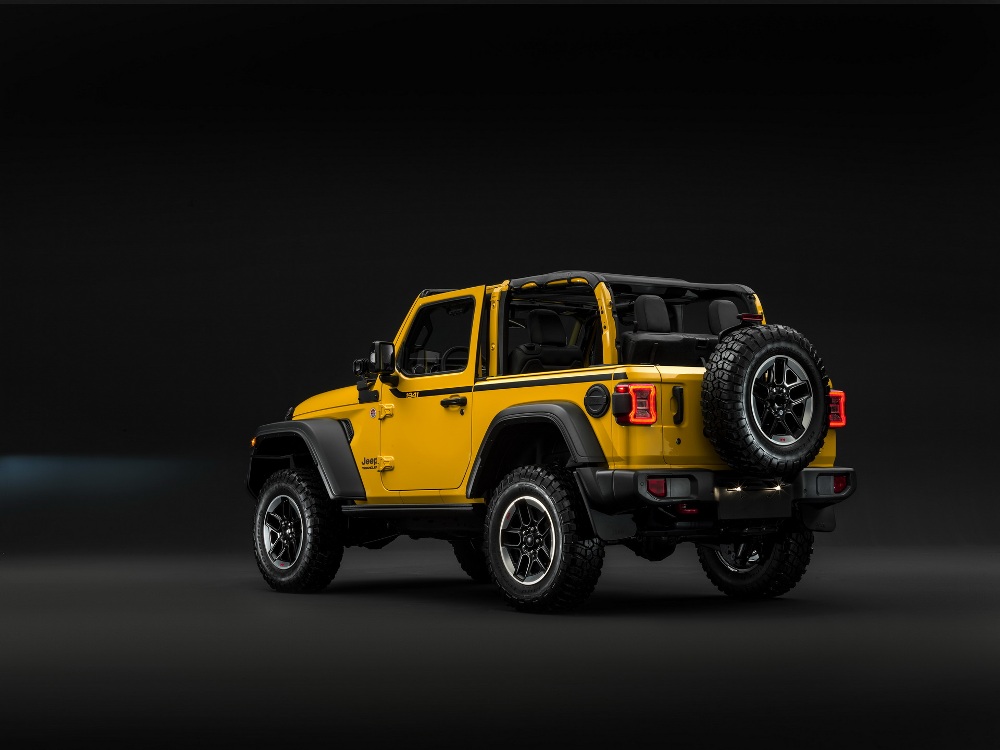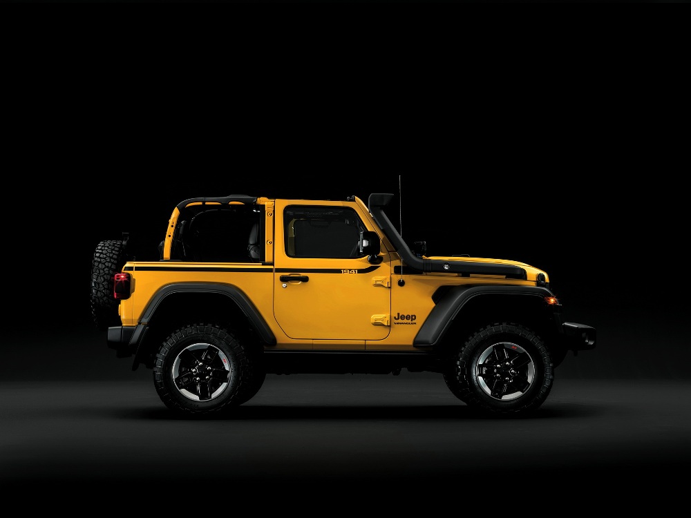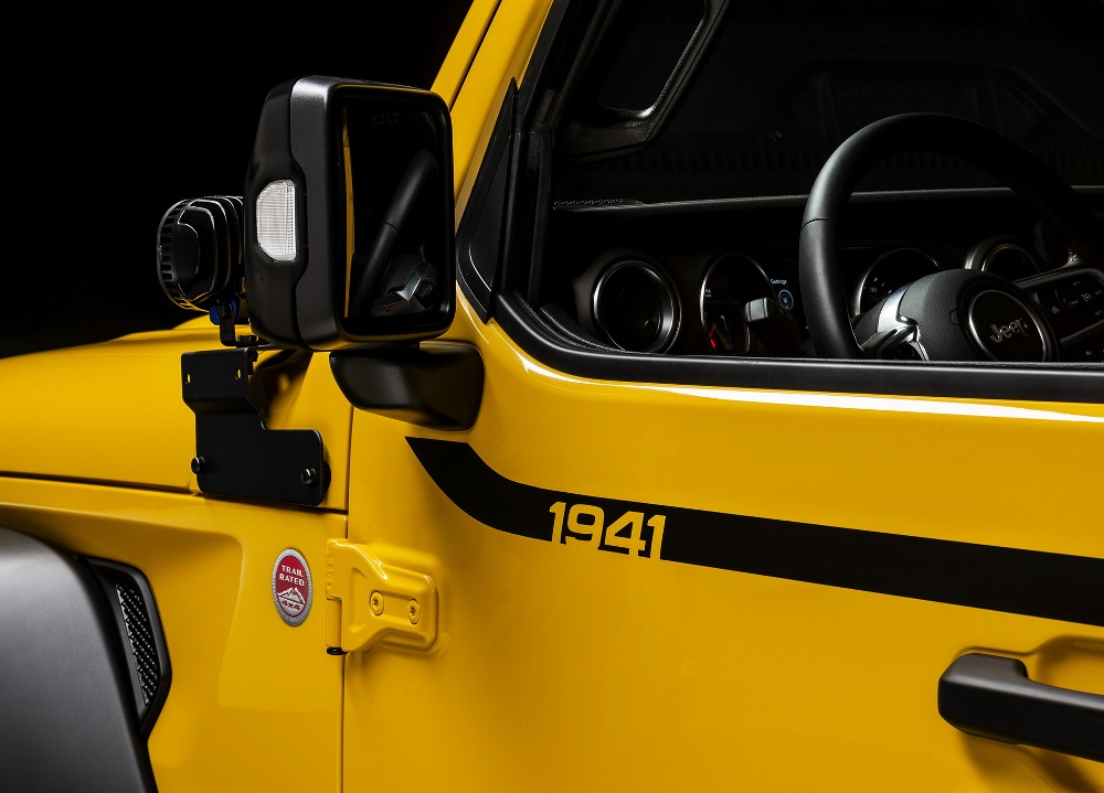 Terminado en color amarillo Hella Yella, el Jeep Wrangler Rubicon 1941 presenta una decoración específica “1941” que conmemora un año muy importante para el fabricante: la aparición del Willys. Esta decoración la podemos ver en detalles presentes en el capó y los laterales de la carrocería gracias a unos adhesivos específicos, así como en las llantas y en el interior (palanca de cambios y la base del portón trasero.