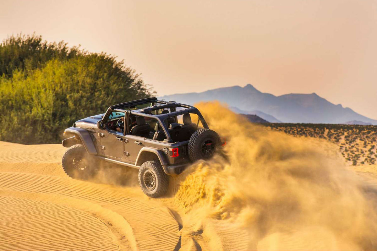 Lógicamente el propulsor es el que se lleva toda la atención, al menos de primeras. Se trata de un bloque 6.4 V8 que desarrolla 477 CV de potencia y 637 Nm de par máximo, asociado a una caja de cambios automática de ocho velocidades con levas al volante (algo inédito en un Wrangler) y a un sistema de tracción integral. No es que sea un coche pensado para hacer carreras de aceleración, pero su 0-100 km/h en 4,5 segundos es una cifra digna de mencionar.