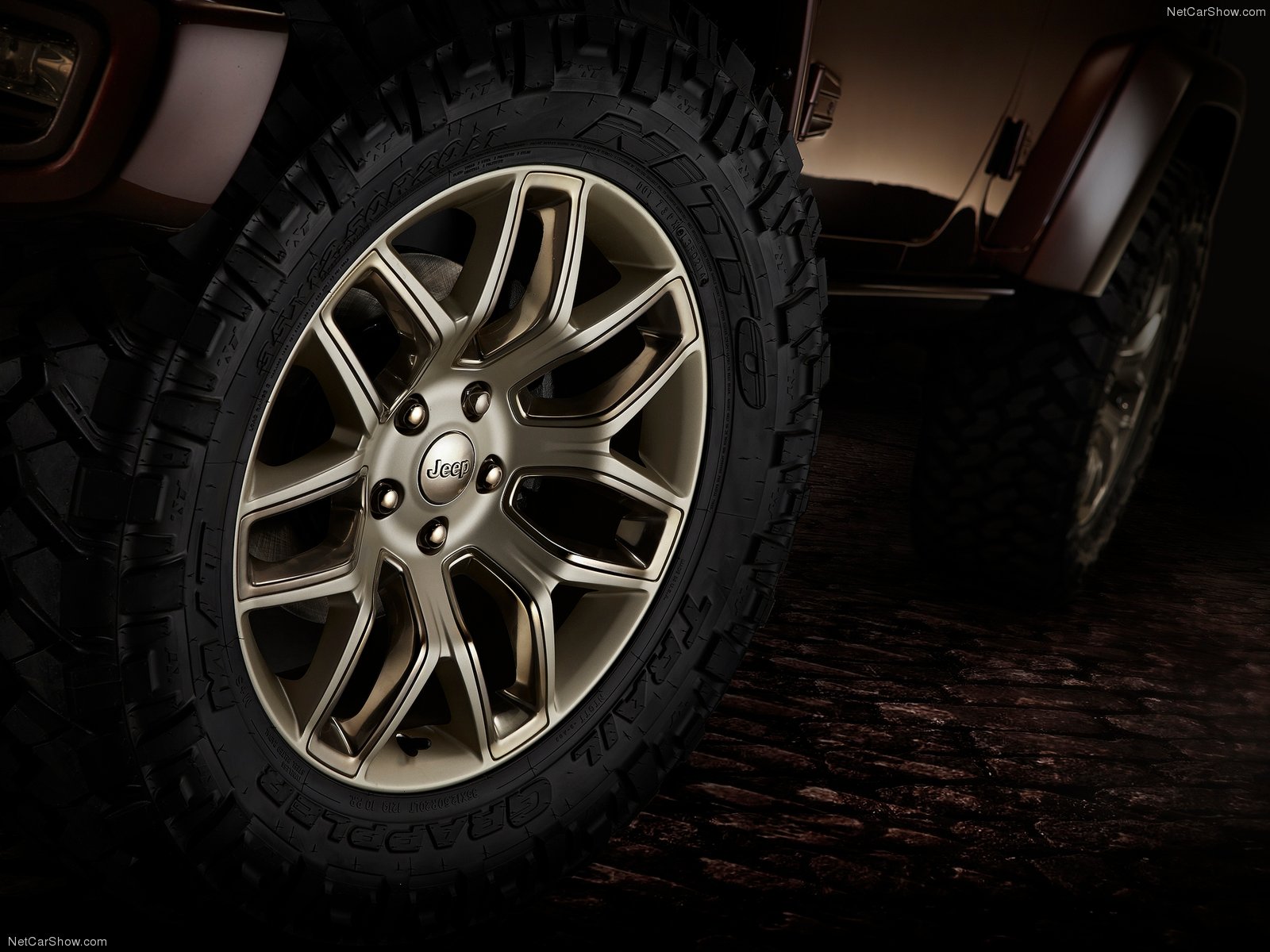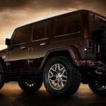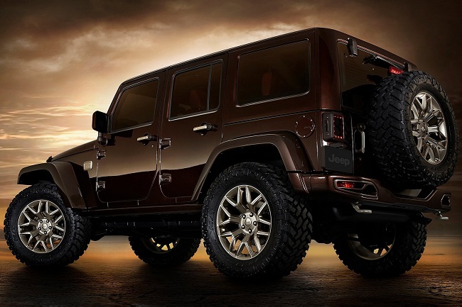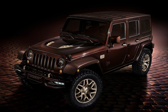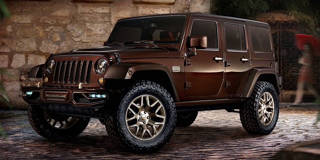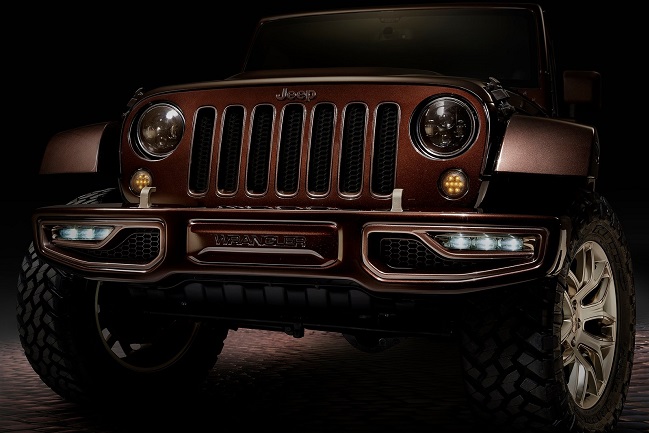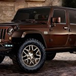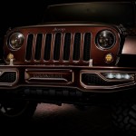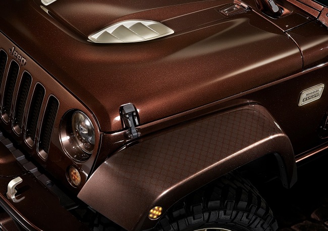 Con el Wrangler Sundacer Concept la firma estadounidense busca resaltar el lado más sofisticado, con un toque de moda, del rudo 4x4. Para ello, han pintado la carrocería de color marrón chocolate metalizado y han incluido numerosos detalles acabados en tonos dorados. Monta parachoques delantero y trasero específicos pintados del mismo color que el resto de la carrocería. Las llantas de aleación de 20 pulgadas de diámetro y los neumáticos con marcado carácter offroad completan los cambios en el exterior.