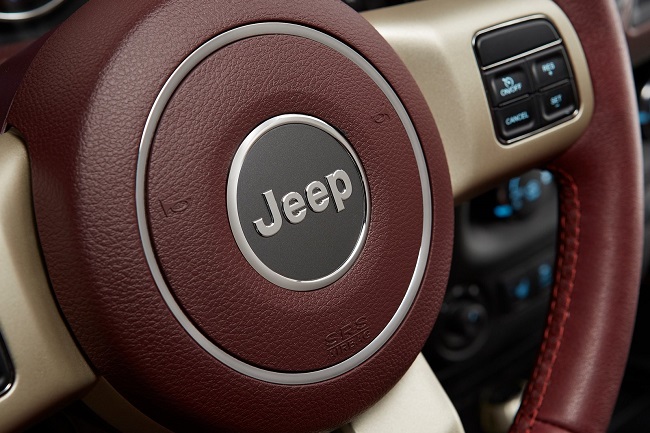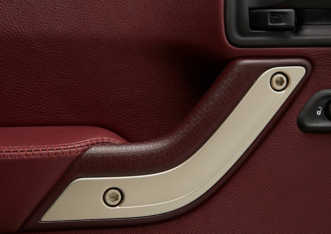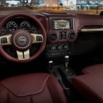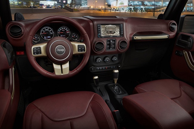 El habitáculo del Jeep Wrangler Sundacer Concept se diferencia por la exclusiva tapicería de cuero empleada, del mismo material del que emplean las firmas de alta costura y que cubre tanto los asientos como los paneles de las puertas. Y al igual que sucede en el exterior, también encontramos numerosos detalles rematados en color dorado, como en los tiradores de las puertas, en los embellecedores del volante o en la palanca de cambios, por ejemplo.