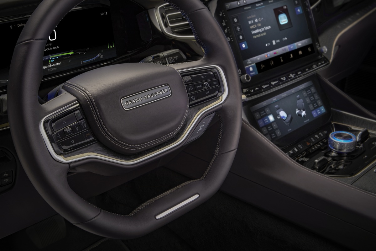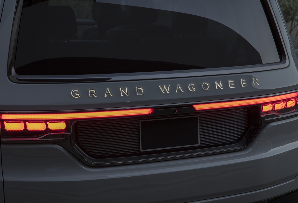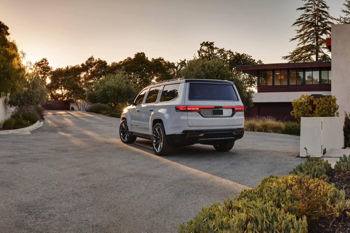 La luz cobra especial atención en la parte delantera puesto que también alumbra la parte superior de la parrilla. Ésta está conectada directamente a los grupos ópticos, delgados, horizontales y con proyectores LED bifuncionales. De camino a la zaga comprobaremos el espíritu aventurero del Jeep Grand Wagoneer: defensas de plástico, barras en el techo y, sobre todo, llantas de aluminio de 24 pulgadas con unos pasos de rueda en forma de trapecio.