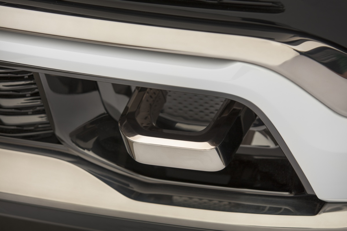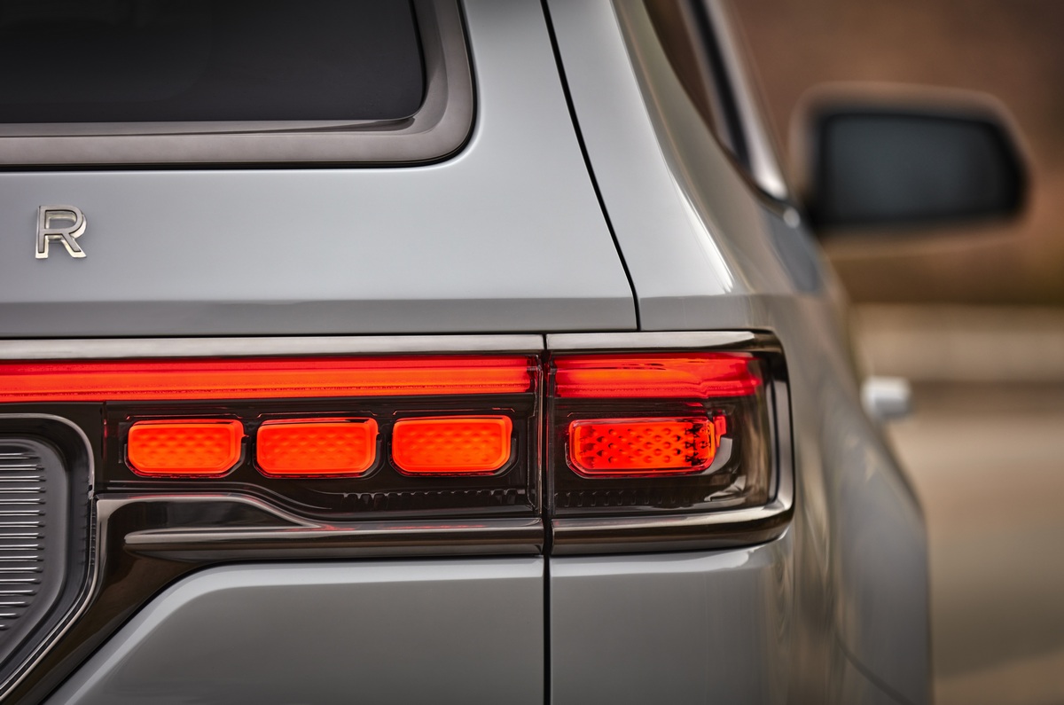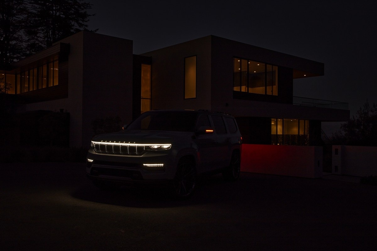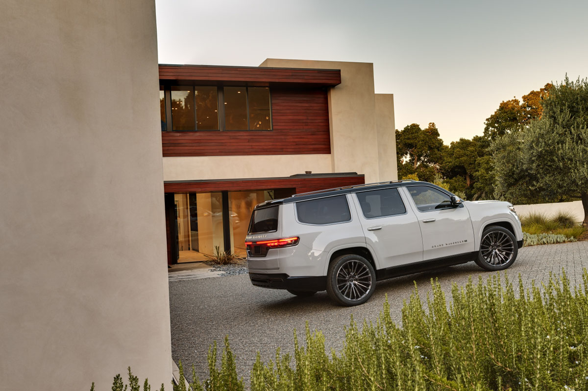 La luz cobra especial atención en la parte delantera puesto que también alumbra la parte superior de la parrilla. Ésta está conectada directamente a los grupos ópticos, delgados, horizontales y con proyectores LED bifuncionales. De camino a la zaga comprobaremos el espíritu aventurero del Jeep Grand Wagoneer: defensas de plástico, barras en el techo y, sobre todo, llantas de aluminio de 24 pulgadas con unos pasos de rueda en forma de trapecio.