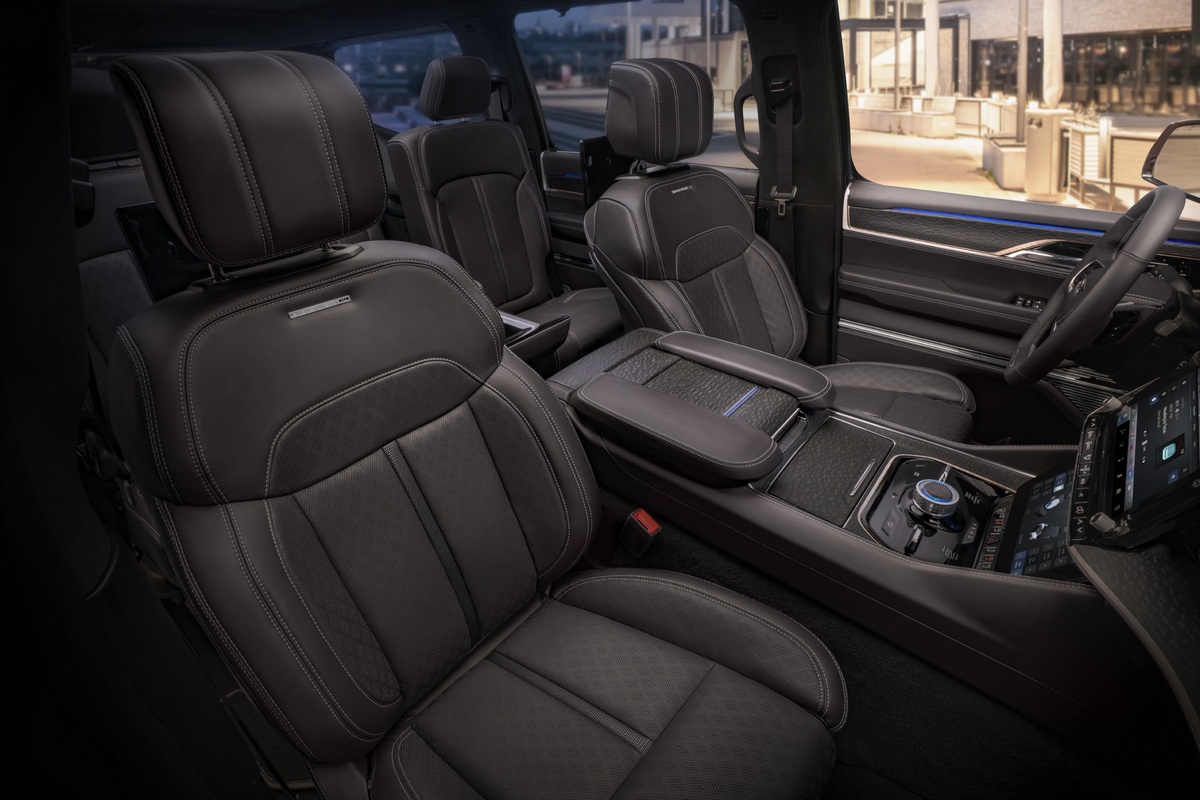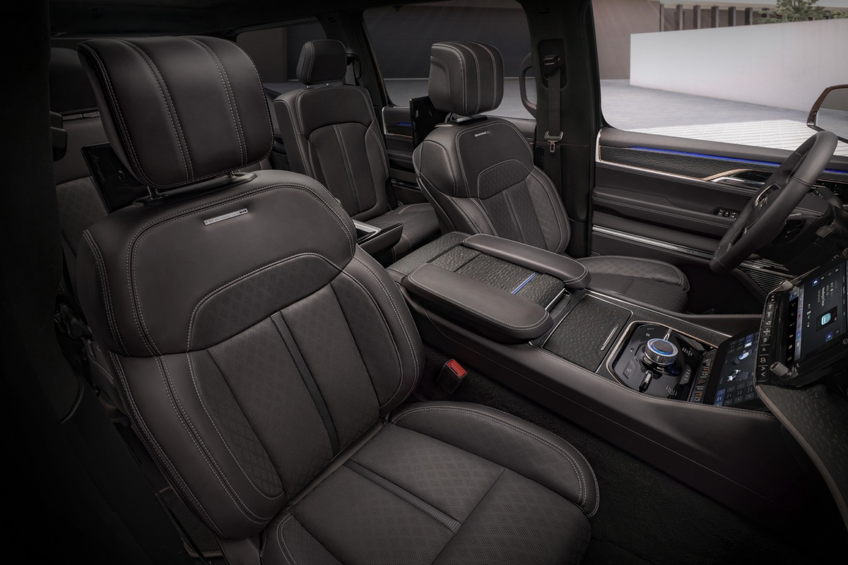 El interior del Jeep Grand Wagoneer Concept está configurado para albergar a siete personas con una configuración 2+3+2: las dos primeras filas cuentan con asientos independientes, mientras que la tercera está pensada para un uso más puntual.